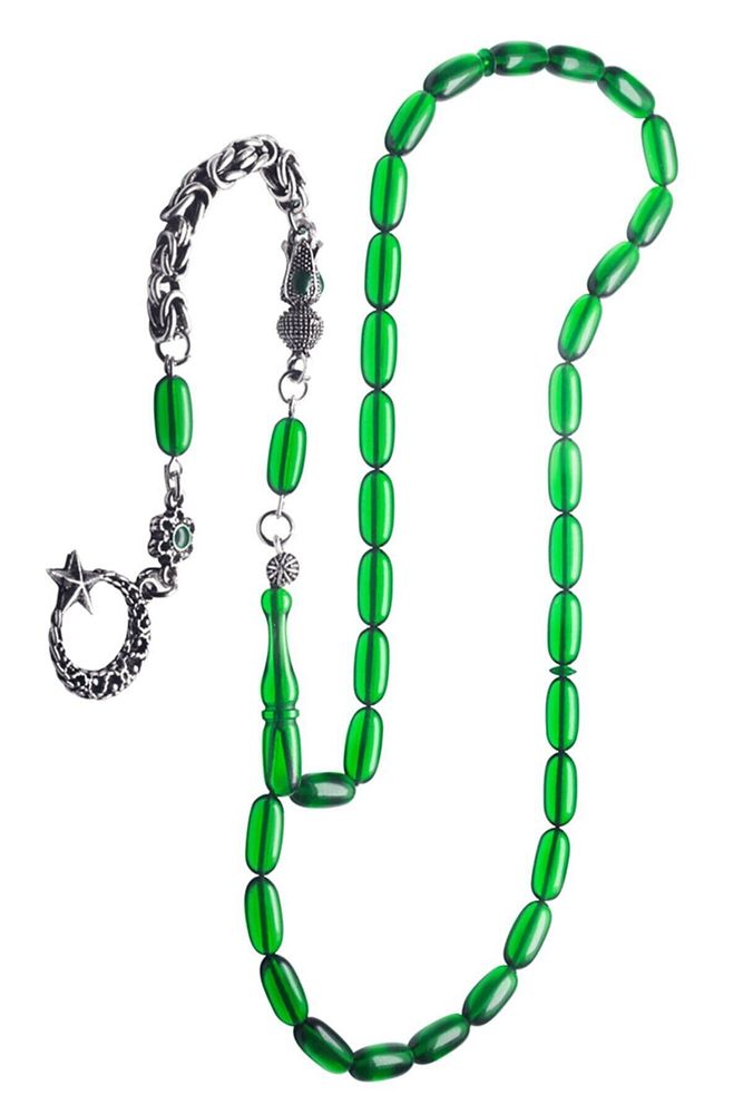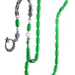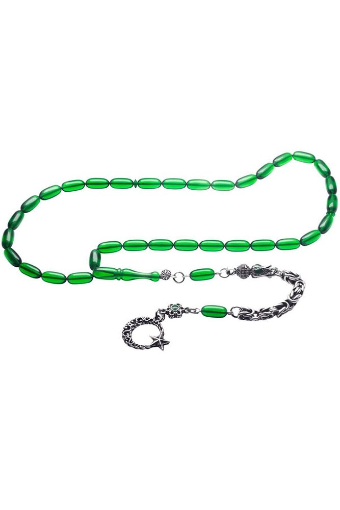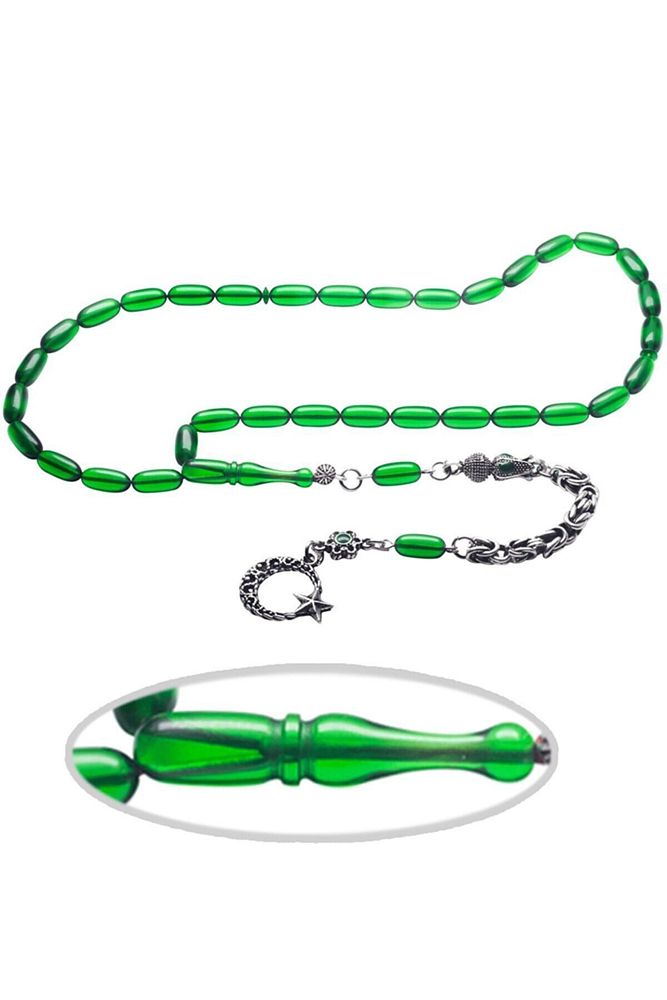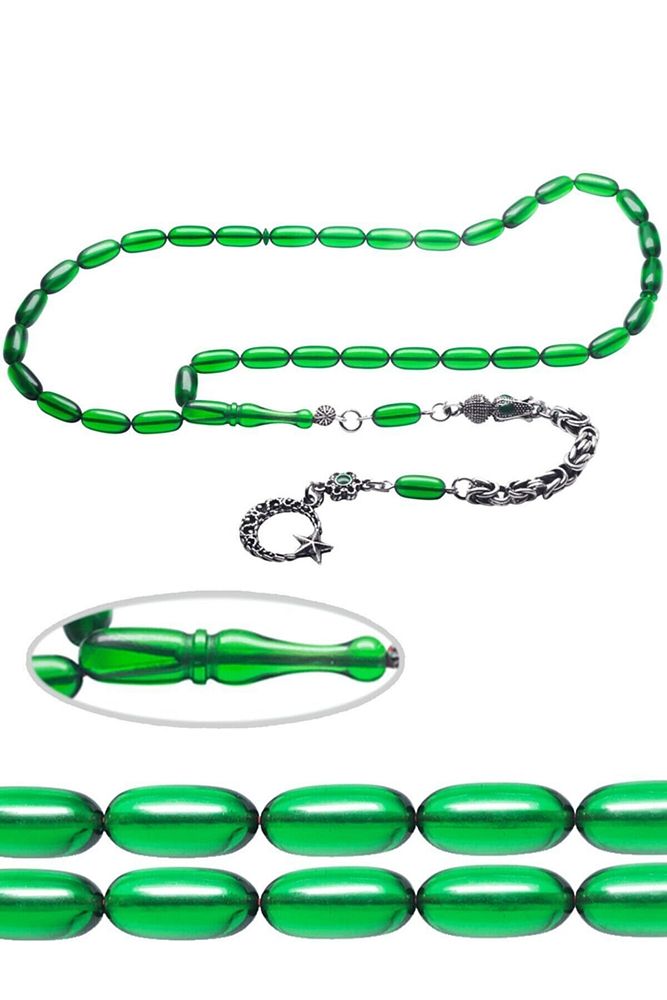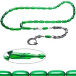 Ürün ya da Doğal Taş Açıklaması (Ağrı Kesici, Sinir Stres ve Bereket Taşı) Ateş kehribar tesbih modelleri, ”Tesbih Atölyesi” Atölyelerinde ustalarımız tarafından kuru torna işciliği ile elde özen ile tane tane işlenmektedir. Ürünlerimiz el işciliği olduğu için sınırlı sayıda üretilmektedir. Tasarımlarımızda kullandığımız reçineler Dünya’nın en kaliteli reçineleridir. Kısa bir süre içerisinde renk alır ve koku verir. Ürünleriniz orijinallik ve garanti belgesi ile gönderilir. Tasarımlarımıza üç kat cila atılmıştır. Muhteşem bir çekime sahip koleksiyonluk ve günlük çekim için ideal ürünlerdir. Bu tasarımda; Ultra şeffaf yeşil renkli özel 1.sınıf kalitede renk alan ve koku veren kaliteli ateş kehribar reçine kullanılmıştır. Her kehribar tanesi birbirinin aynısı olmadığı için küçükte olsa farklılıklar gösterebilir. Üretildiği Malzeme; Ateş Kehribar; Ana Renk; Yeşil Renk; Ağırlık; 20-30 gr; Tane Şekli; 5.5×11 mm; Tane Ölçüsü; Aspirin Kapsül Kesim; Toplam Uzunluk; 20-30 cm; İmame ve Püskül Maddesi; Düşük Ayar Gümüş;