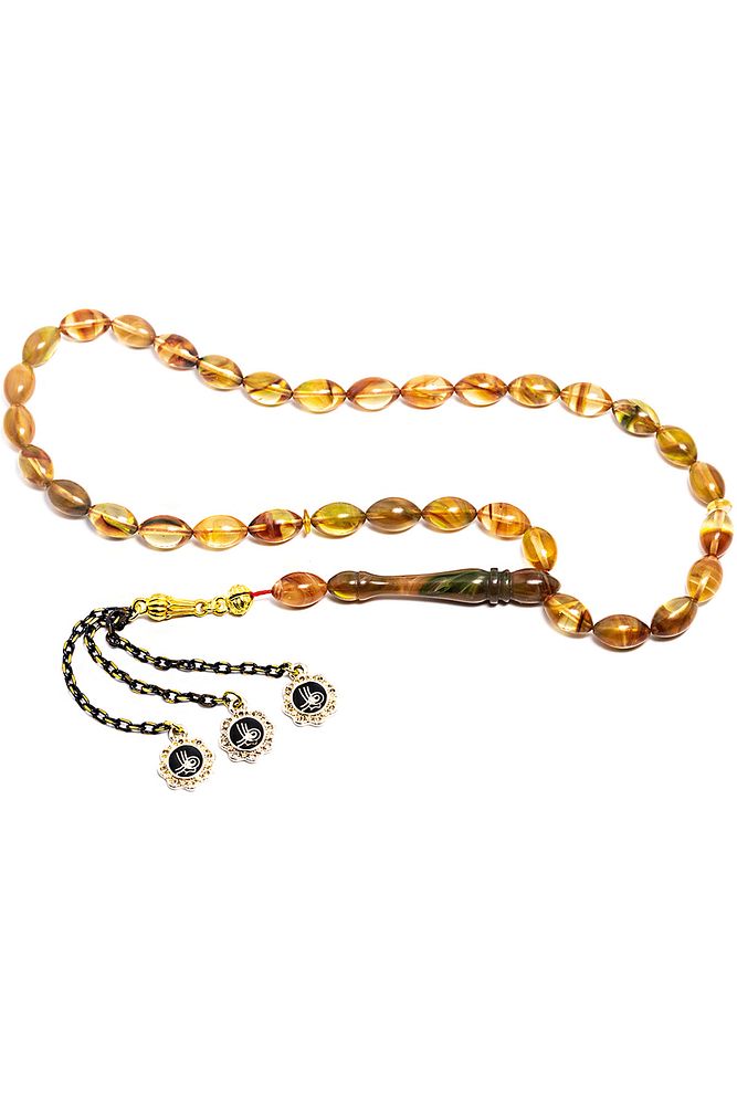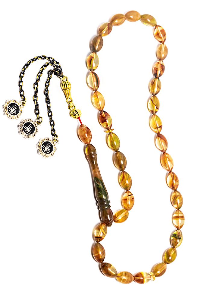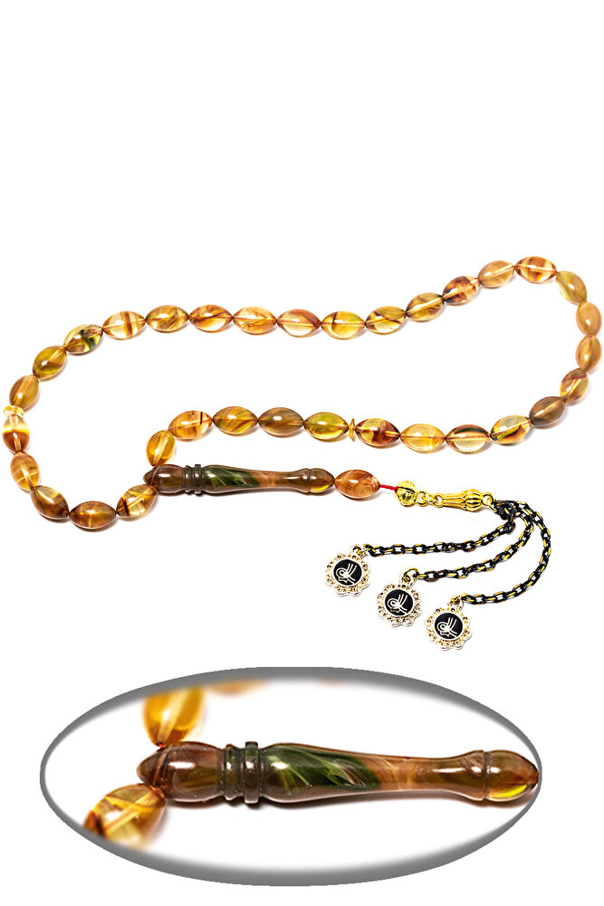 Yeşil Şeffaf Renkli Üçlü Püsküllü Sıkma Kehribar Tesbih