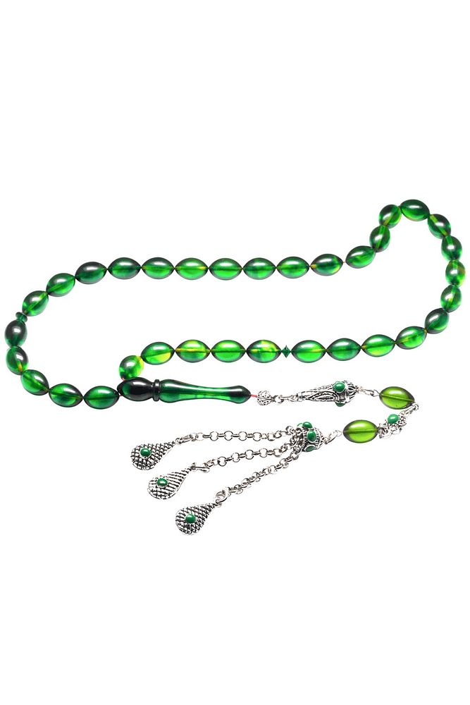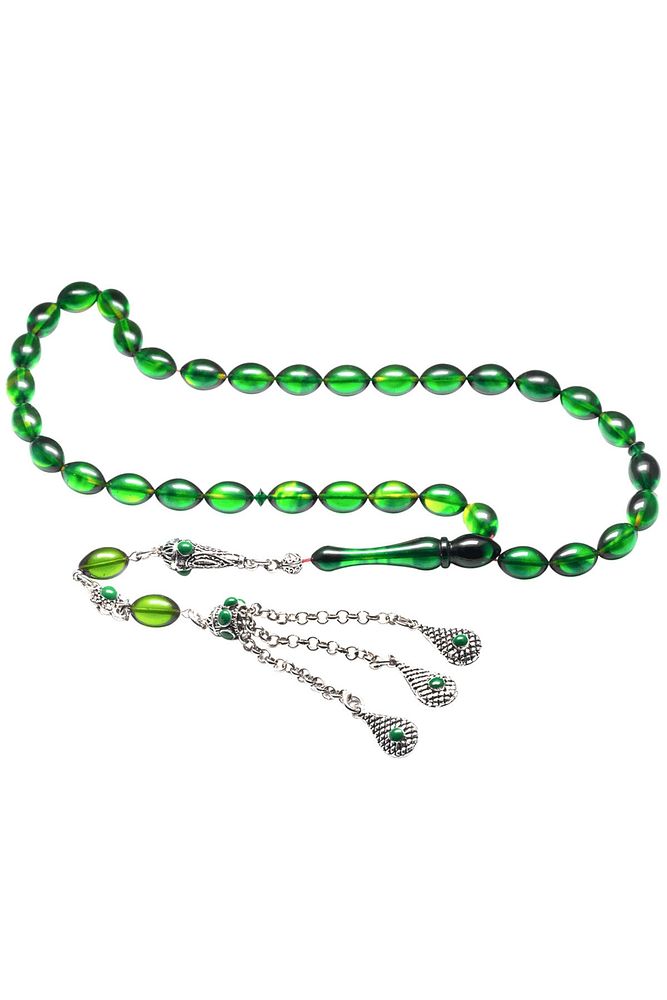 Ürün ya da Doğal Taş Açıklaması (Ağrı Kesici, Sinir Stres ve Bereket Taşı) Ateş kehribar tesbih modelleri, \'\'Tesbih Atölyesi\'\' Atölyelerinde ustalarımız tarafından kuru torna işciliği ile elde özen ile tane tane işlenmektedir. Ürünlerimiz el işciliği olduğu için sınırlı sayıda üretilmektedir. Tasarımlarımızda kullandığımız reçineler Dünya\'nın en kaliteli reçineleridir. Kısa bir süre içerisinde renk alır ve koku verir. Ürünleriniz orijinallik ve garanti belgesi ile gönderilir. Tasarımlarımıza üç kat cila atılmıştır. Muhteşem bir çekime sahip koleksiyonluk ve günlük çekim için ideal ürünlerdir. Bu tasarımda; Yeşil ve siyah renkli şeffaf özel renk alan ve koku veren kaliteli ateş kehribar reçine kullanılmıştır. Her kehribar tanesi birbirinin aynısı olmadığı için küçükte olsa farklılıklar gösterebilir. Üretildiği Malzeme; Ateş Kehribar; Ana Renk; Yeşil ve Siyah Renk; Ağırlık; 20-30 gr; Tane Şekli; 8x11.5 mm; Tane Ölçüsü; Beyzi Kesim; Toplam Uzunluk; 20-30 cm; İmame ve Püskül Maddesi; Düşük Ayar Gümüş;