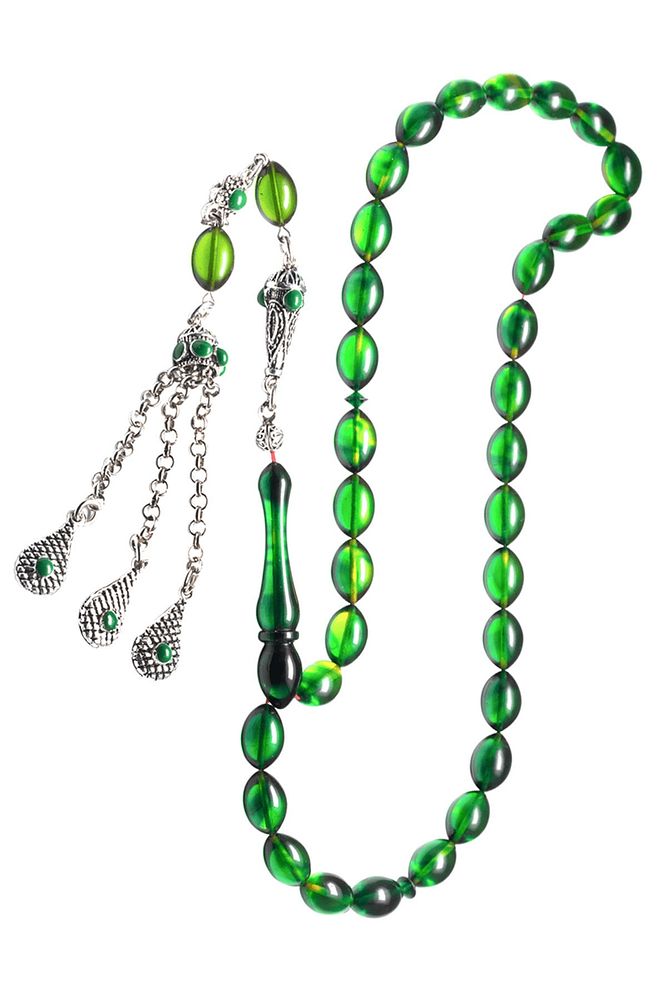 Yeşil Siyah Renkli Beyzi Kesim Halep Püsküllü Ateş Kehribar Tesbih