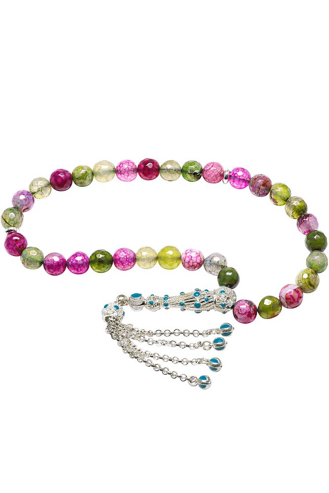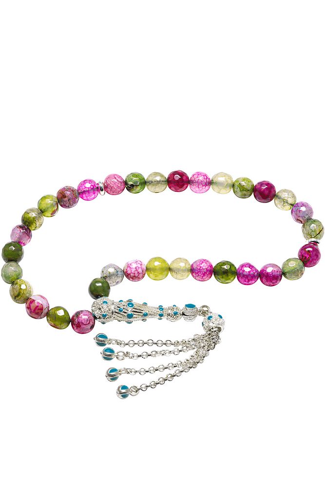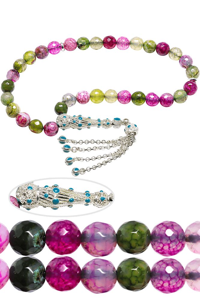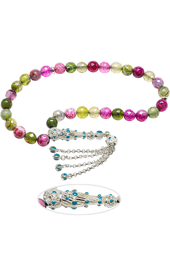 Bu tasarımda; Yoğun damarlı özel üzeri koruyucu boya kaplamalı Ruby Zoisite taşı kullanılmıştır. Beyaz mavi mineli sarı renkli sarı mineli telkari imame ve püskül seti kullanılmıştır. Çift kaplama atıldığı için renk atmaz ve kararmaz bir yapıya sahiptir.
