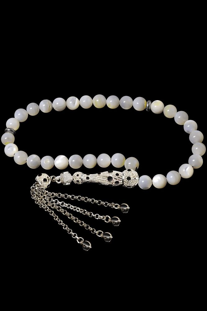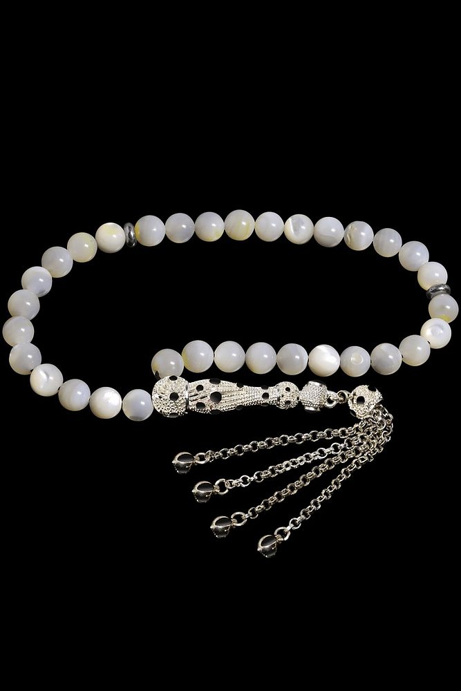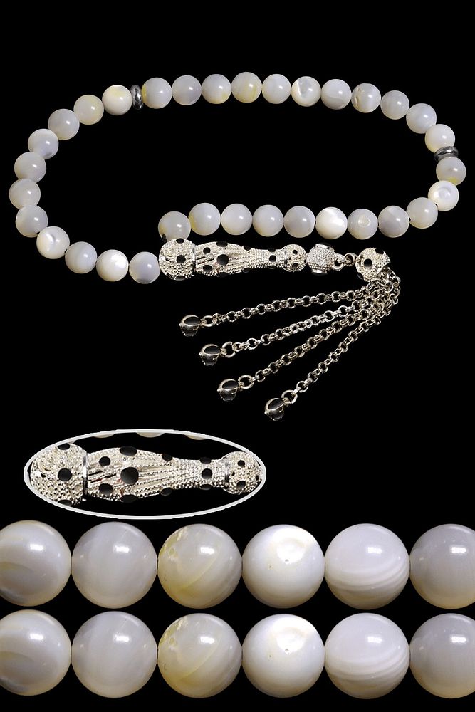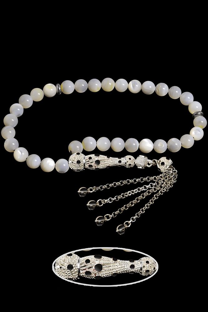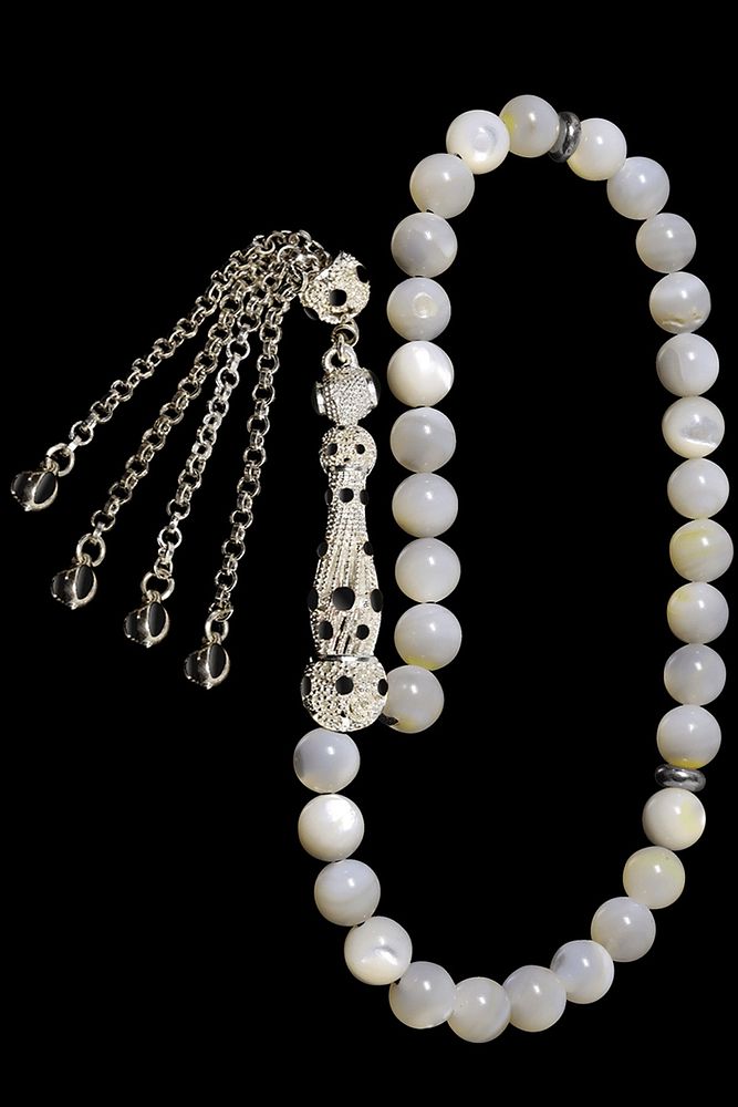 Beyaz Siyah Mineli Telkari Püsküllü Bilek Boy Sedef Taşı Tesbih