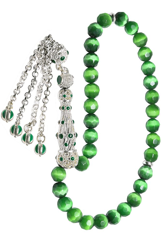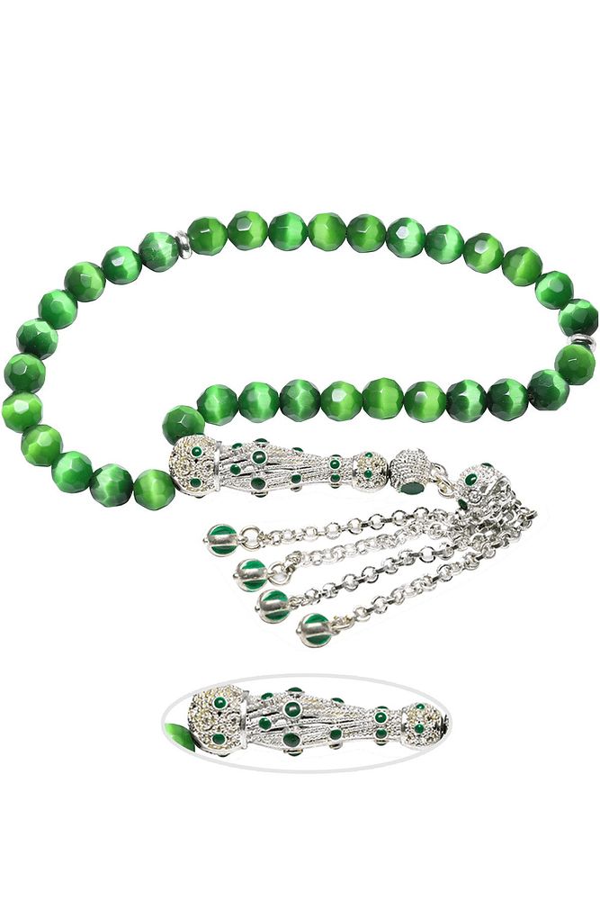 Beyaz Yeşil Mineli Telkari Püskül Doğal Yeşil Kedi Gözü Taşı Tesbih