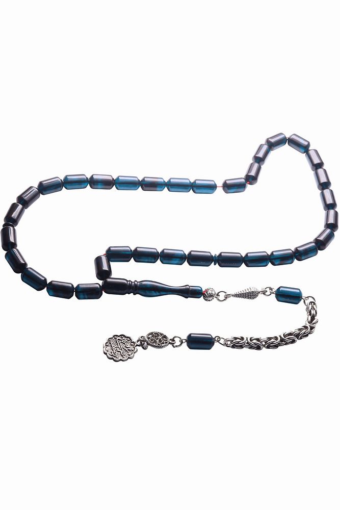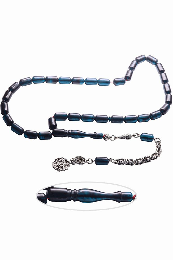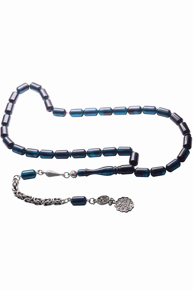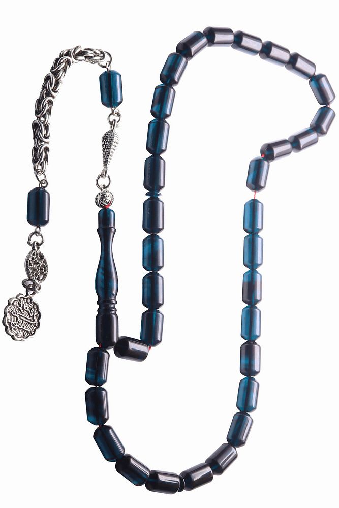 Ürün ya da Doğal Taş Açıklaması (Ağrı Kesici, Sinir Stres ve Bereket Taşı) Ateş kehribar tesbih modelleri, ''Tesbih Atölyesi'' Atölyelerinde ustalarımız tarafından kuru torna işciliği ile elde özen ile tane tane işlenmektedir. Ürünlerimiz el işciliği olduğu için sınırlı sayıda üretilmektedir. Tasarımlarımızda kullandığımız reçineler Dünya'nın en kaliteli reçineleridir. Kısa bir süre içerisinde renk alır ve koku verir. Ürünleriniz orijinallik ve garanti belgesi ile gönderilir. Tasarımlarımıza üç kat cila atılmıştır. Muhteşem bir çekime sahip koleksiyonluk ve günlük çekim için ideal ürünlerdir. Bu tasarımda; Dışı siyah renkli içi mavi renkli özel 1.sınıf çift renk alan ve koku veren kaliteli ateş kehribar reçine kullanılmıştır. Her kehribar tanesi birbirinin aynısı olmadığı için küçükte olsa farklılıklar gösterebilir. Üretildiği Malzeme; Ateş Kehribar; Ana Renk; Dışı Siyah İçi Mavi Renk; Ağırlık; 20-30 gr; Tane Şekli; 8x12 mm; Tane Ölçüsü; Kapsül Kesim; Toplam Uzunluk; 20-30 cm; İmame ve Püskül Maddesi; Düşük Ayar Gümüş;
