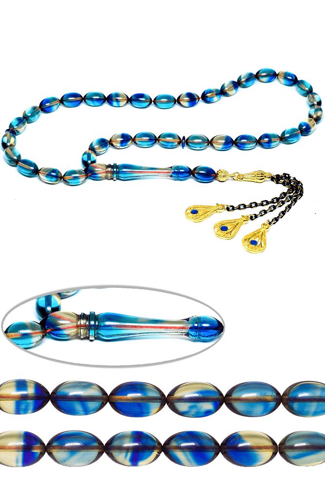 Üretildiği Malzeme : Ateş Kehribar Ana Renk : Gece Mavisi Renk Ağırlık : 20-30 gr Tane Şekli : 7x11 mm Tane Ölçüsü : Beyzi Kesim Toplam Uzunluk : 20-30 cm İmame ve Püskül Maddesi : Düşük Ayar Gümüş