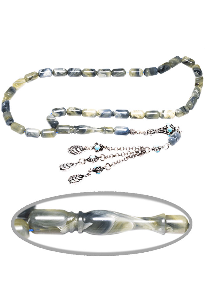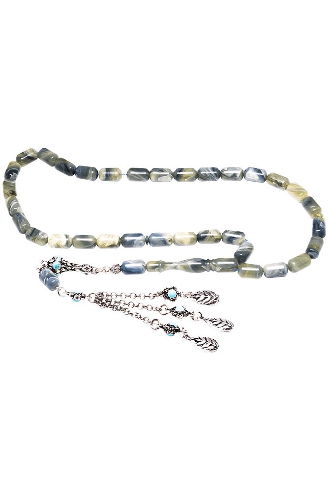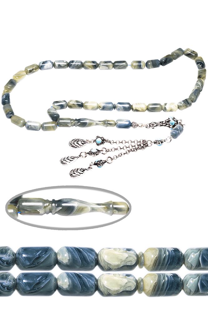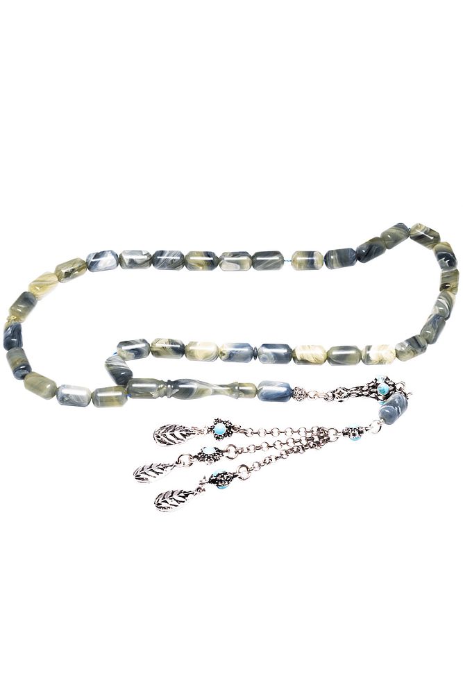 Gri Mavi Renkli Yoğun Hareli Sıkma Kehribar Tesbih