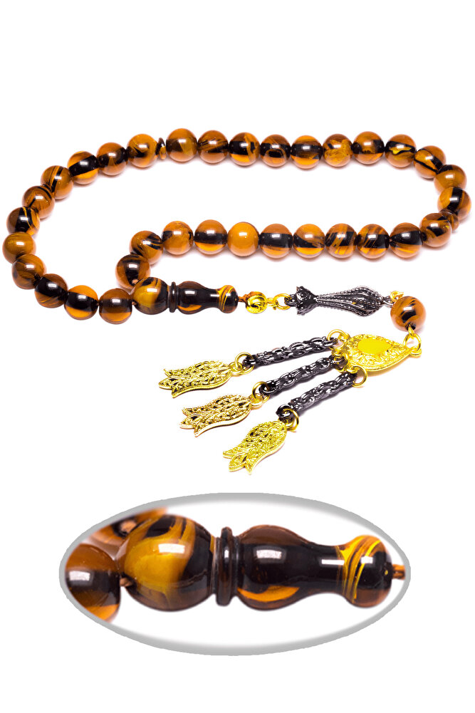 Bu tasarımda; Turuncu renkli yoğun hareli özel 1.kalite sıkma kehribar reçine kullanılmıştır.