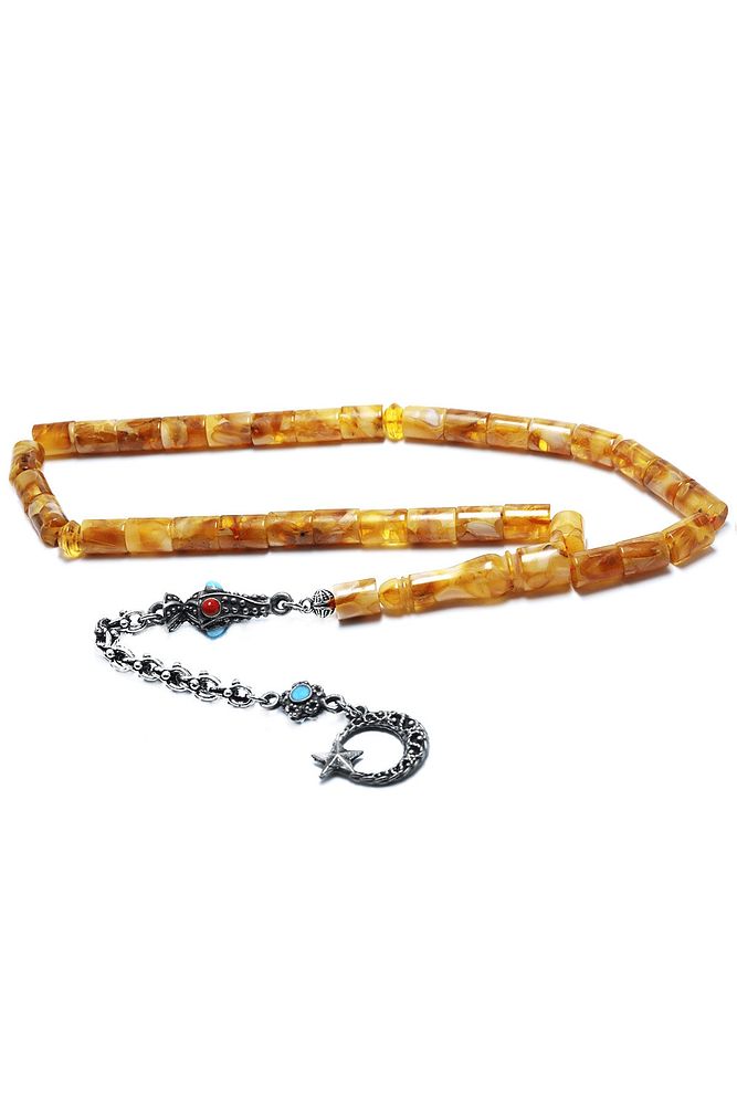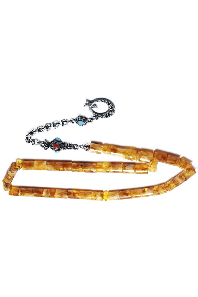 Ürün ya da Doğal Taş Açıklaması (Doğal Sakinleştirici, Astım, Guatr ve Ağrı Kesici Taşı) Doğal damla kehribar tesbih modelleri, \'\'Tesbih Atölyesi\'\' Atölyelerinde ustalarımız tarafından kuru torna işciliği ile elde özen ile tane tane işlenmektedir. Ürünlerimiz el işciliği olduğu için sınırlı sayıda üretilmektedir. Üzerine üç kat el cilası atılmıştır. Kehribar çam ağacının fosilleşmiş reçinesidir. Baltık ülkelerinden en kaliteli kehribar kütlelerini ithal etmekteyiz. Damla kehribar tesbih Buram buram çam kokulu ürünlerimiz %100 doğal, garantili ve sertifikalıdır. Ürünlerimiz fabrikasyon olmadığı için kehribar tanelerinin hiç biri birbirinin aynısı olmadığı için küçükte olsa farklılıklar olabilir. Bu tasarımda; Kesme kesim renk almış damla kehribar taşı kullanılmıştır. Püskül yapımında; Renk atmaz, kararmaz, matlaşmaz düşük ayar gümüş kullanılmıştır. Üretildiği Taş; Kehribar Taşı; Renk; Doğal Renk; Ağırlık; 14 gr; Tane Şekli; 6.5x7.3 mm; Tane Ölçüsü; Kesme Kesim; Toplam Uzunluk; 20-30 cm; Püskül Maddesi; Düşük Ayar Gümüş;