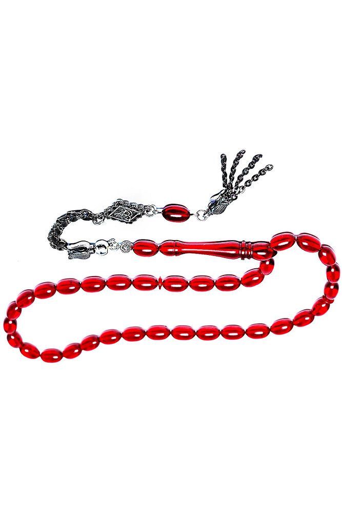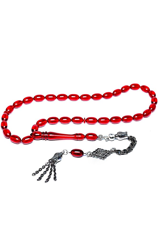 Ürün ya da Doğal Taş Açıklaması (Ağrı Kesici, Sinir Stres ve Bereket Taşı) Ateş kehribar tesbih modelleri, ''Tesbih Atölyesi'' Atölyelerinde ustalarımız tarafından kuru torna işciliği ile elde özen ile tane tane işlenmektedir. Ürünlerimiz el işciliği olduğu için sınırlı sayıda üretilmektedir. Tasarımlarımızda kullandığımız reçineler Dünya'nın en kaliteli reçineleridir. Kısa bir süre içerisinde renk alır ve koku verir. Ürünleriniz orijinallik ve garanti belgesi ile gönderilir. Tasarımlarımıza üç kat cila atılmıştır. Muhteşem bir çekime sahip koleksiyonluk ve günlük çekim için ideal ürünlerdir. Bu tasarımda; Şeffaf kırmızı özel muhteşem parlak renk alan kaliteli ateş kehribar reçine kullanılmıştır. Her kehribar tanesi birbirinin aynısı olmadığı için küçükte olsa farklılıklar gösterebilir. Üretildiği Malzeme; Ateş Kehribar; Ana Renk; Kırmızı Renk; Ağırlık; 20-30 gr; Tane Şekli; 7x11 mm; Tane Ölçüsü; Beyzi Kesim; Toplam Uzunluk; 20-30 cm; İmame ve Püskül Maddesi; Düşük Ayar Gümüş;
