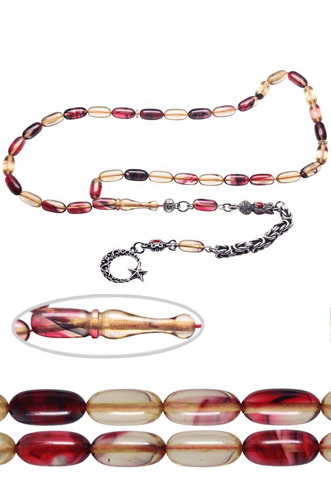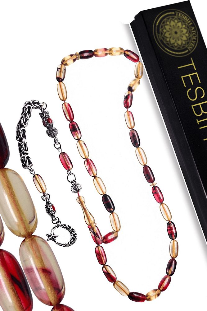 Ürün ya da Doğal Taş Açıklaması; ; (Ağrı Kesici, Sinir Stres ve Bereket Taşı); ; Ateş kehribar tesbih modelleri, ''Tesbih Atölyesi'' Atölyelerinde ustalarımız tarafından kuru torna işciliği ile elde özen ile tane tane işlenmektedir. Ürünlerimiz el işciliği olduğu için sınırlı sayıda üretilmektedir. Tasarımlarımızda kullandığımız reçineler Dünya'nın en kaliteli reçineleridir. Kısa bir süre içerisinde renk alır ve koku verir. Ürünleriniz orijinallik ve garanti belgesi ile gönderilir. Tasarımlarımıza üç kat cila atılmıştır. Muhteşem bir çekime sahip koleksiyonluk ve günlük çekim için ideal ürünlerdir.; ; Bu tasarımda; Şeffaf kırmızı renkli özel 1.sınıf renk alan ve koku veren kaliteli ateş kehribar reçine kullanılmıştır. Her kehribar tanesi birbirinin aynısı olmadığı için küçükte olsa farklılıklar gösterebilir.; ; Üretildiği Malzeme; Ateş Kehribar; Ana Renk; Şeffaf Kırmızı Renk; Ağırlık; 20-30 gr; Tane Şekli; 5.5x11 mm; Tane Ölçüsü; Aspirin Kapsül Kesim; Toplam Uzunluk; 20-30 cm; İmame ve Püskül Maddesi; Düşük Ayar Gümüş;