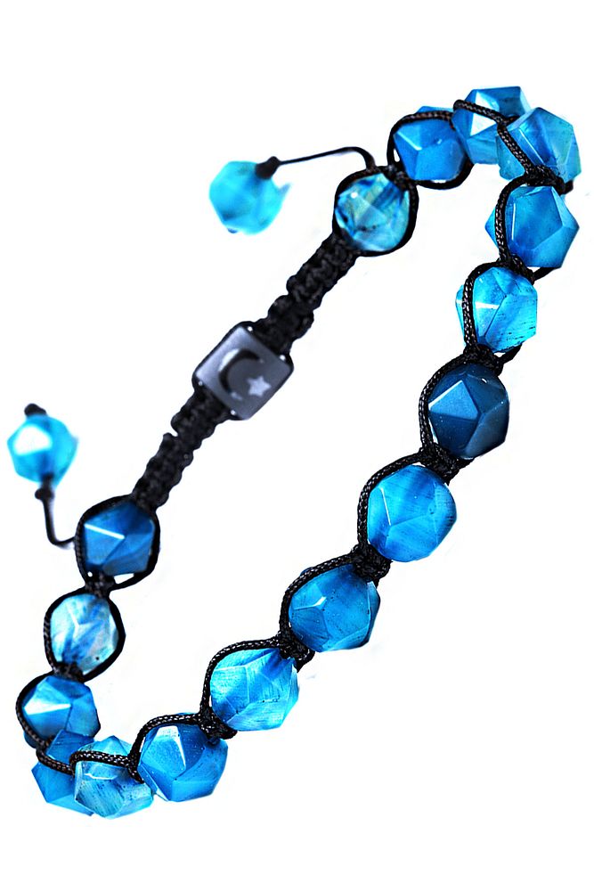 Bu tasarımda; Elmas Kesim Fasetli Mavi Akik kullanılmıştır. Makrome ipi 30 kat ip örülerek yapıldığı için asla kopmaz ve aşınmayacak her bileğe göre ayarlanabilir boyuttadır.