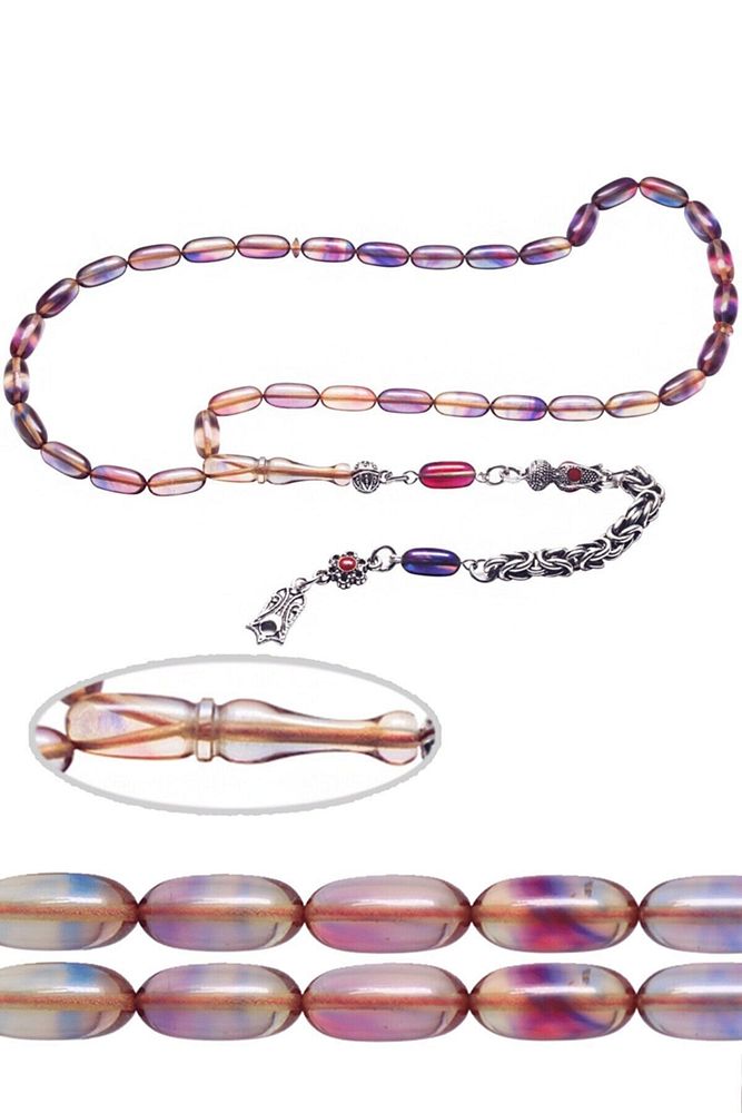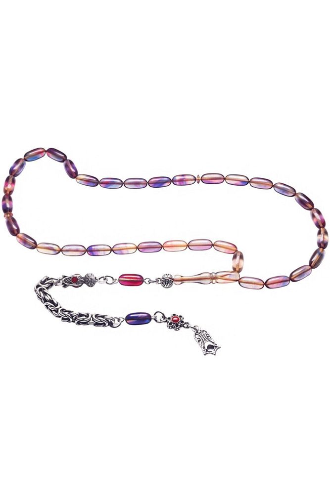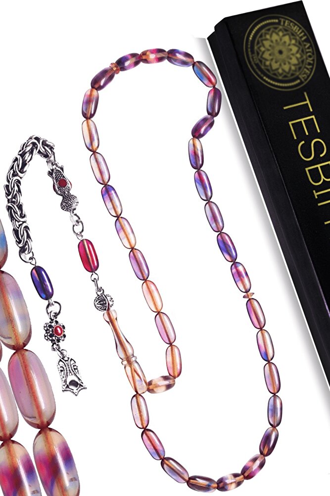 (Ağrı Kesici, Sinir Stres ve Bereket Taşı); ; Ateş kehribar tesbih modelleri, ''Tesbih Atölyesi'' Atölyelerinde ustalarımız tarafından kuru torna işciliği ile elde özen ile tane tane işlenmektedir. Ürünlerimiz el işciliği olduğu için sınırlı sayıda üretilmektedir. Tasarımlarımızda kullandığımız reçineler Dünya'nın en kaliteli reçineleridir. Kısa bir süre içerisinde renk alır ve koku verir. Ürünleriniz orijinallik ve garanti belgesi ile gönderilir. Tasarımlarımıza üç kat cila atılmıştır. Muhteşem bir çekime sahip koleksiyonluk ve günlük çekim için ideal ürünlerdir.; ; Bu tasarımda; Mavi ve mor renkli özel 1.sınıf şeffaf renk alan ve koku veren kaliteli ateş kehribar reçine kullanılmıştır. Her kehribar tanesi birbirinin aynısı olmadığı için küçükte olsa farklılıklar gösterebilir.; ; Üretildiği Malzeme; Ateş Kehribar; Ana Renk; Mavi Mor Renk; Ağırlık; 20-30 gr; Tane Şekli; 5.5x11 mm; Tane Ölçüsü; Aspirin Kapsül Kesim; Toplam Uzunluk; 20-30 cm; İmame ve Püskül Maddesi; Düşük Ayar Gümüş;