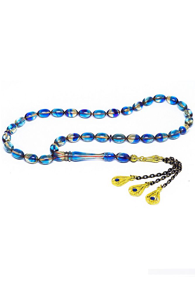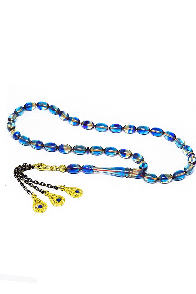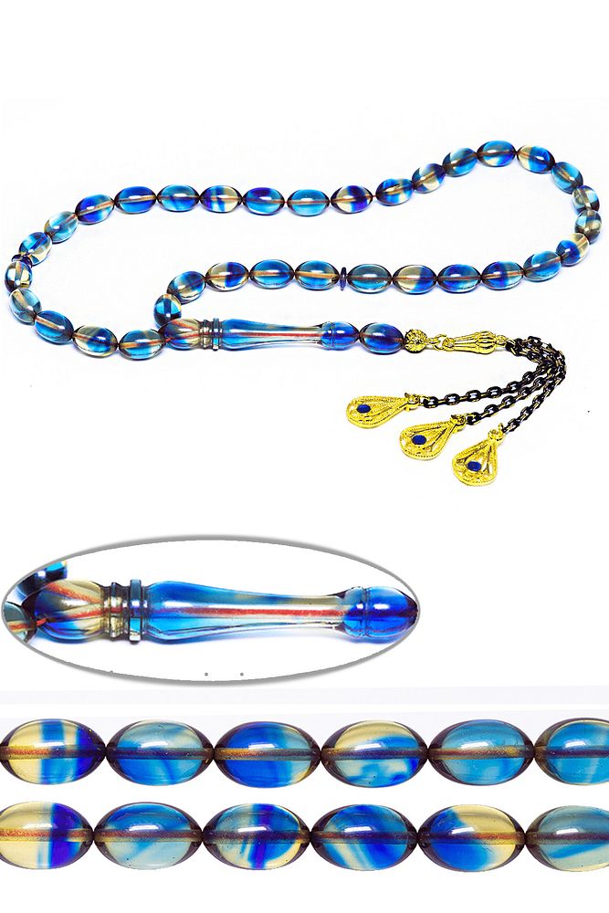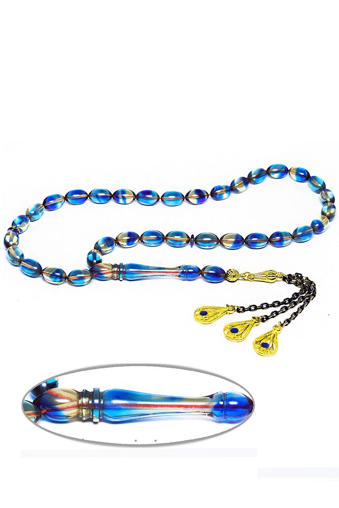 Mavi Renkli Mineli Püsküllü Beyzi Kesim Ateş Kehribar Tesbih