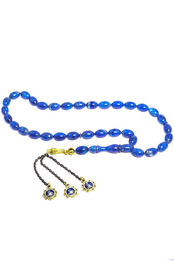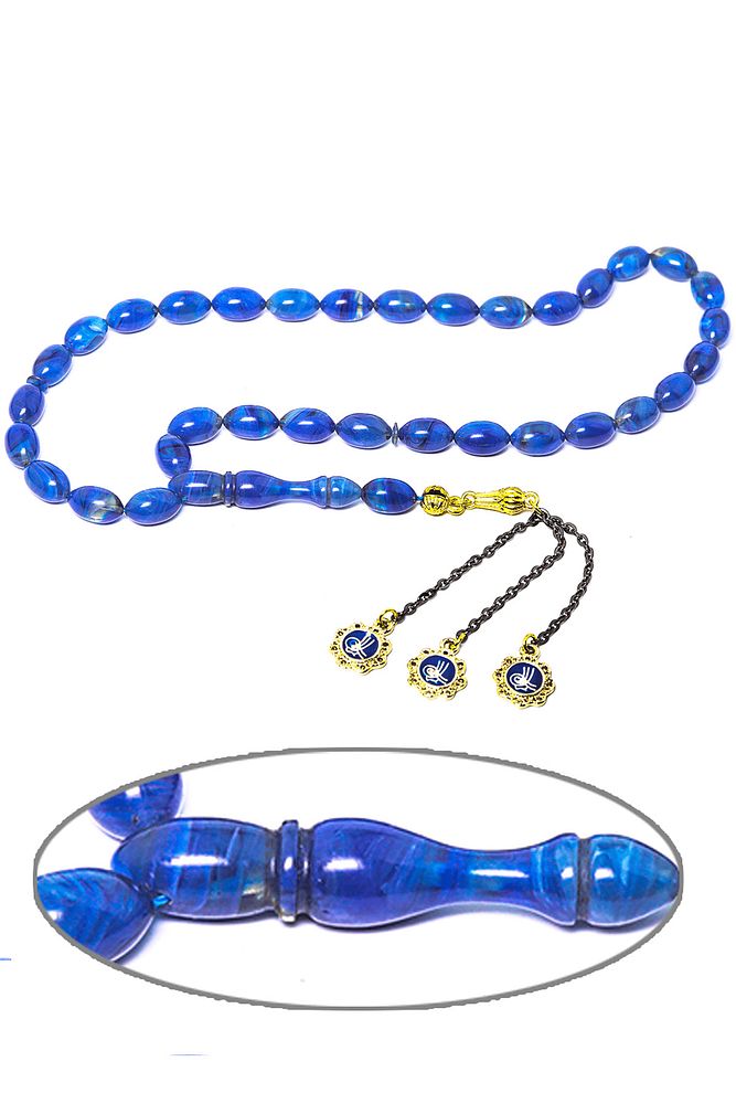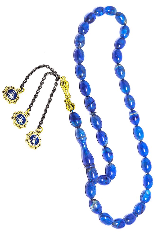 Mavi Renkli Yoğun Hareli Özel Sıkma Kehribar Tesbih