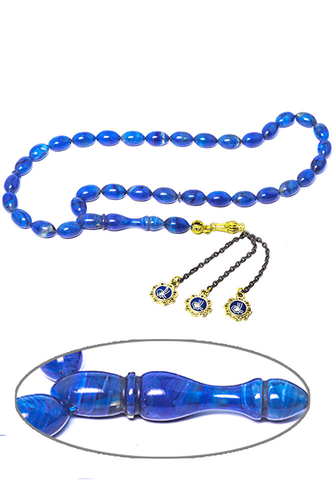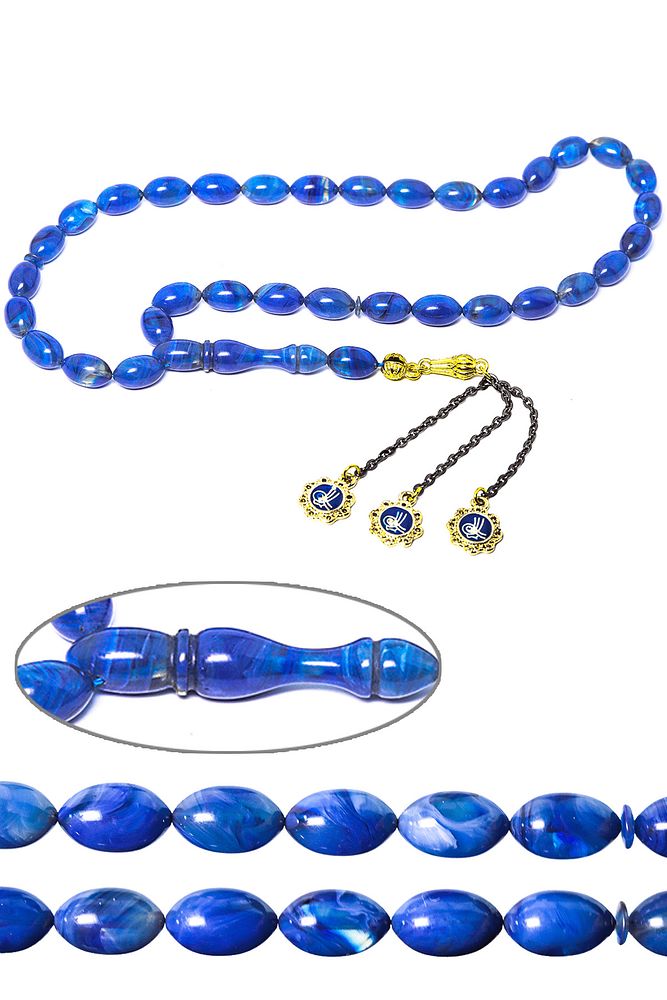 Bu tasarımda; Koyu mavi renkli özel hareli 1.kalite sıkma kehribar reçine kullanılmıştır.