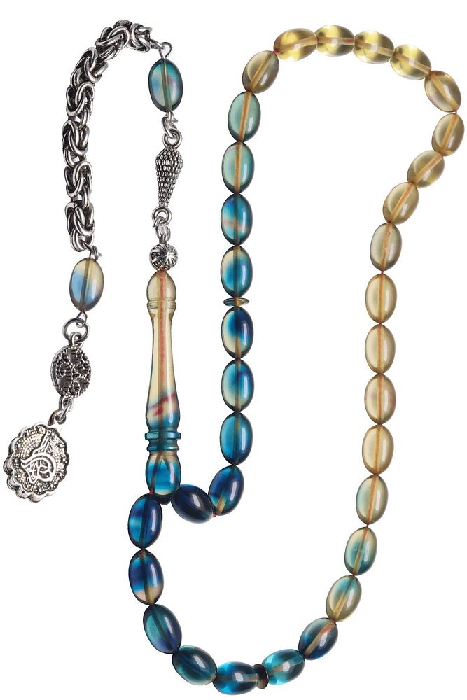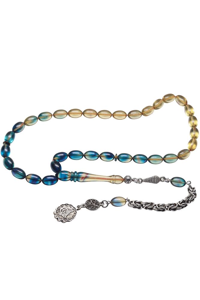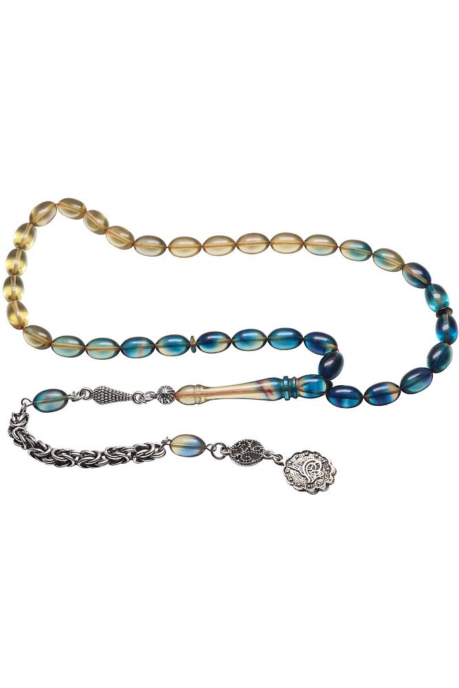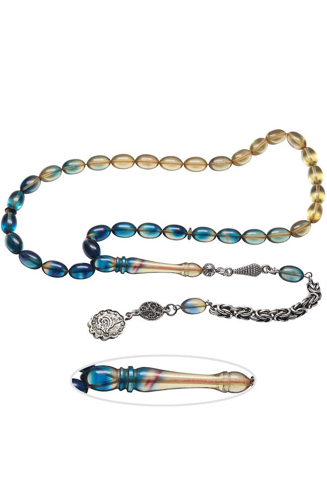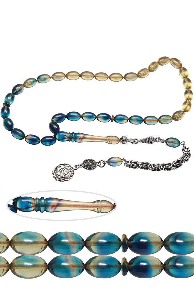 Ürün ya da Doğal Taş Açıklaması (Ağrı Kesici, Sinir Stres ve Bereket Taşı) Ateş kehribar tesbih modelleri, \'\'Tesbih Atölyesi\'\' Atölyelerinde ustalarımız tarafından kuru torna işciliği ile elde özen ile tane tane işlenmektedir. Ürünlerimiz el işciliği olduğu için sınırlı sayıda üretilmektedir. Tasarımlarımızda kullandığımız reçineler Dünya\'nın en kaliteli reçineleridir. Kısa bir süre içerisinde renk alır ve koku verir. Ürünleriniz orijinallik ve garanti belgesi ile gönderilir. Tasarımlarımıza üç kat cila atılmıştır. Muhteşem bir çekime sahip koleksiyonluk ve günlük çekim için ideal ürünlerdir. Bu tasarımda; Mavi şeffaf renk geçişli özel 1.sınıf kalitede yer alan renk alan ve koku veren kaliteli ateş kehribar reçine kullanılmıştır. Her kehribar tanesi birbirinin aynısı olmadığı için küçükte olsa farklılıklar gösterebilir. Üretildiği Malzeme; Ateş Kehribar; Ana Renk; avi ve Şeffaf Renk; Ağırlık; 20-30 gr; Tane Şekli; 7x11 mm; Tane Ölçüsü; Beyzi Kesim; Toplam Uzunluk; 20-30 cm; İmame ve Püskül Maddesi; Düşük Ayar Gümüş;