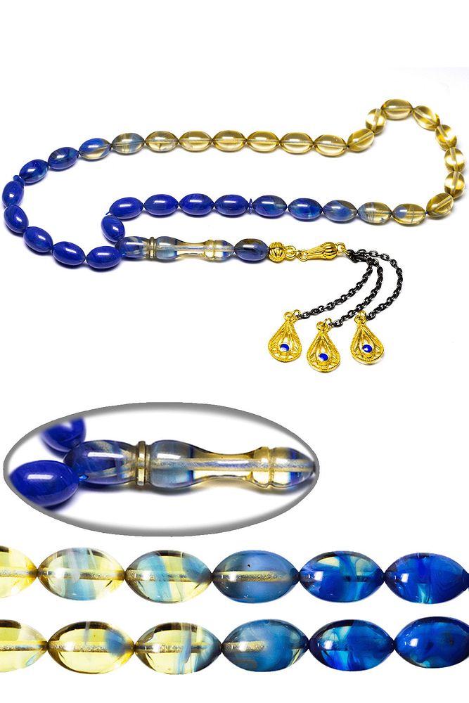 Mavi Şeffaf Renk Hüzmesi Altın Kaplama Püsküllü Ateş Kehribar Tesbih