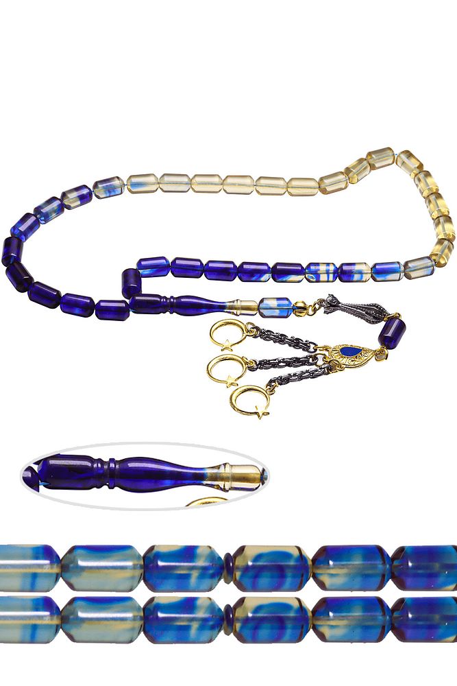 Mavi Şeffaf Renkli Altın Kaplama Püsküllü Ateş Kehribar Tesbih