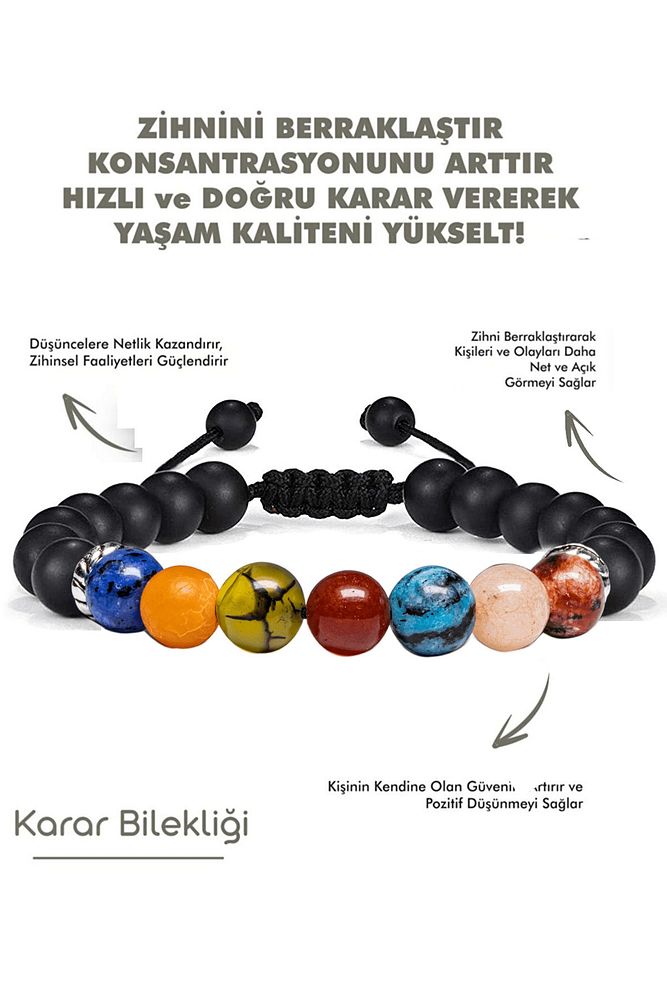 Sertifikalı doğal taşlardan oluşan bu özel öğrenci bilekliği, odaklanma, karar verme ve hedefe kilitlenme temasıyla tasarlanmıştır. 8 mm taş boyutuna sahip bu modelde; mavi akik, turuncu akik, yeşil akik, yakut, apatit, kristal kuvars ve jasper taşları bir araya gelerek hem estetik hem de dikkat çekici bir kombin oluşturur. Arka kısımda kullanılan obsidyen taşlar güçlü bir kontrast sağlarken, terahertz aparatlar bilekliğe modern ve premium bir dokunuş kazandırır.