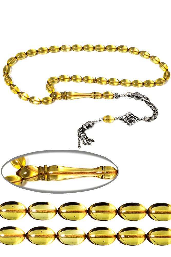 Ürün ya da Doğal Taş Açıklaması (Ağrı Kesici, Sinir Stres ve Bereket Taşı) Ateş kehribar tesbih modelleri, ''Tesbih Atölyesi'' Atölyelerinde ustalarımız tarafından kuru torna işciliği ile elde özen ile tane tane işlenmektedir. Ürünlerimiz el işciliği olduğu için sınırlı sayıda üretilmektedir. Tasarımlarımızda kullandığımız reçineler Dünya'nın en kaliteli reçineleridir. Kısa bir süre içerisinde renk alır ve koku verir. Ürünleriniz orijinallik ve garanti belgesi ile gönderilir. Tasarımlarımıza üç kat cila atılmıştır. Muhteşem bir çekime sahip koleksiyonluk ve günlük çekim için ideal ürünlerdir. Bu tasarımda; Siyah şeffaf renkli özel yoğun hareli renk alan ve koku veren kaliteli ateş kehribar reçine kullanılmıştır. Her kehribar tanesi birbirinin aynısı olmadığı için küçükte olsa farklılıklar gösterebilir. Üretildiği Malzeme; Ateş Kehribar; Ana Renk; Bal Sarısı Şeffaf Renk; Ağırlık; 20-30 gr; Tane Şekli; 7x11 mm; Tane Ölçüsü; Beyzi Kesim; Toplam Uzunluk; 20-30 cm; İmame ve Püskül Maddesi; Düşük Ayar Gümüş;