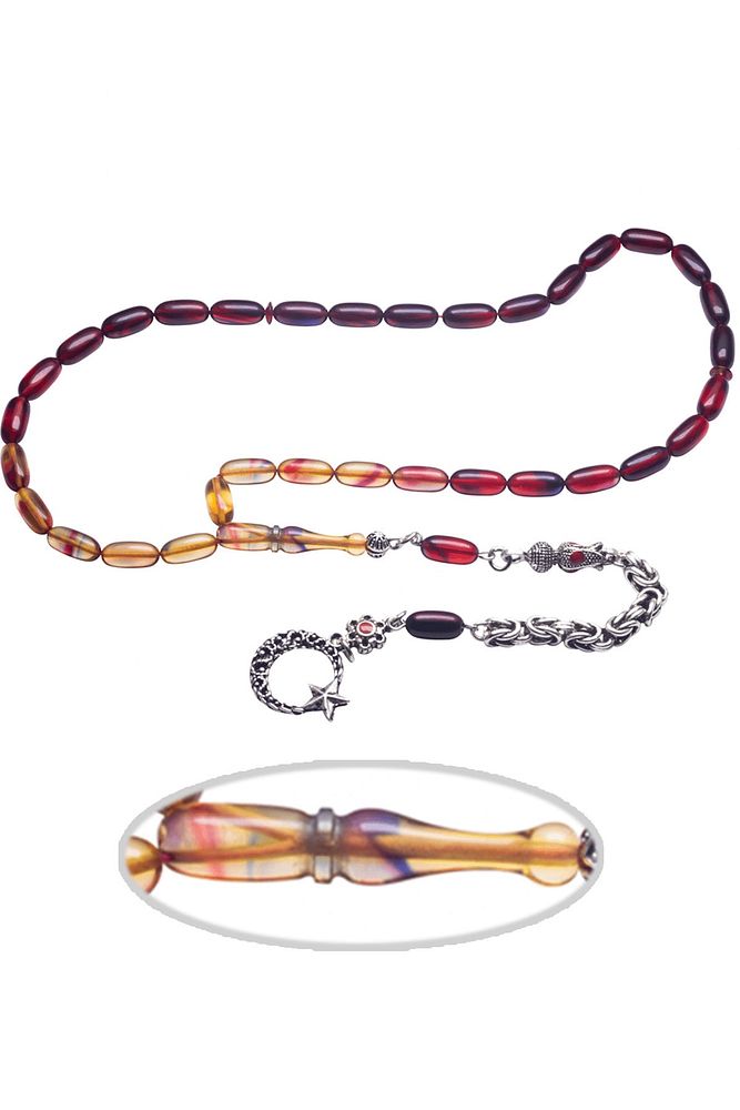 Ürün ya da Doğal Taş Açıklaması (Ağrı Kesici, Sinir Stres ve Bereket Taşı) Ateş kehribar tesbih modelleri, \'\'Tesbih Atölyesi\'\' Atölyelerinde ustalarımız tarafından kuru torna işciliği ile elde özen ile tane tane işlenmektedir. Ürünlerimiz el işciliği olduğu için sınırlı sayıda üretilmektedir. Tasarımlarımızda kullandığımız reçineler Dünya\'nın en kaliteli reçineleridir. Kısa bir süre içerisinde renk alır ve koku verir. Ürünleriniz orijinallik ve garanti belgesi ile gönderilir. Tasarımlarımıza üç kat cila atılmıştır. Muhteşem bir çekime sahip koleksiyonluk ve günlük çekim için ideal ürünlerdir. Bu tasarımda; Sarı kırmızı renkli özel renk alan ve koku veren kaliteli ateş kehribar reçine kullanılmıştır. Her kehribar tanesi birbirinin aynısı olmadığı için küçükte olsa farklılıklar gösterebilir. Üretildiği Malzeme; Ateş Kehribar; Ana Renk; Sarı ve Kırmızı Renk; Ağırlık; 20-30 gr; Tane Şekli; 5.5x11 mm; Tane Ölçüsü; Aspirin Kapsül Kesim; Toplam Uzunluk; 20-30 cm; İmame ve Püskül Maddesi; Düşük Ayar Gümüş;
