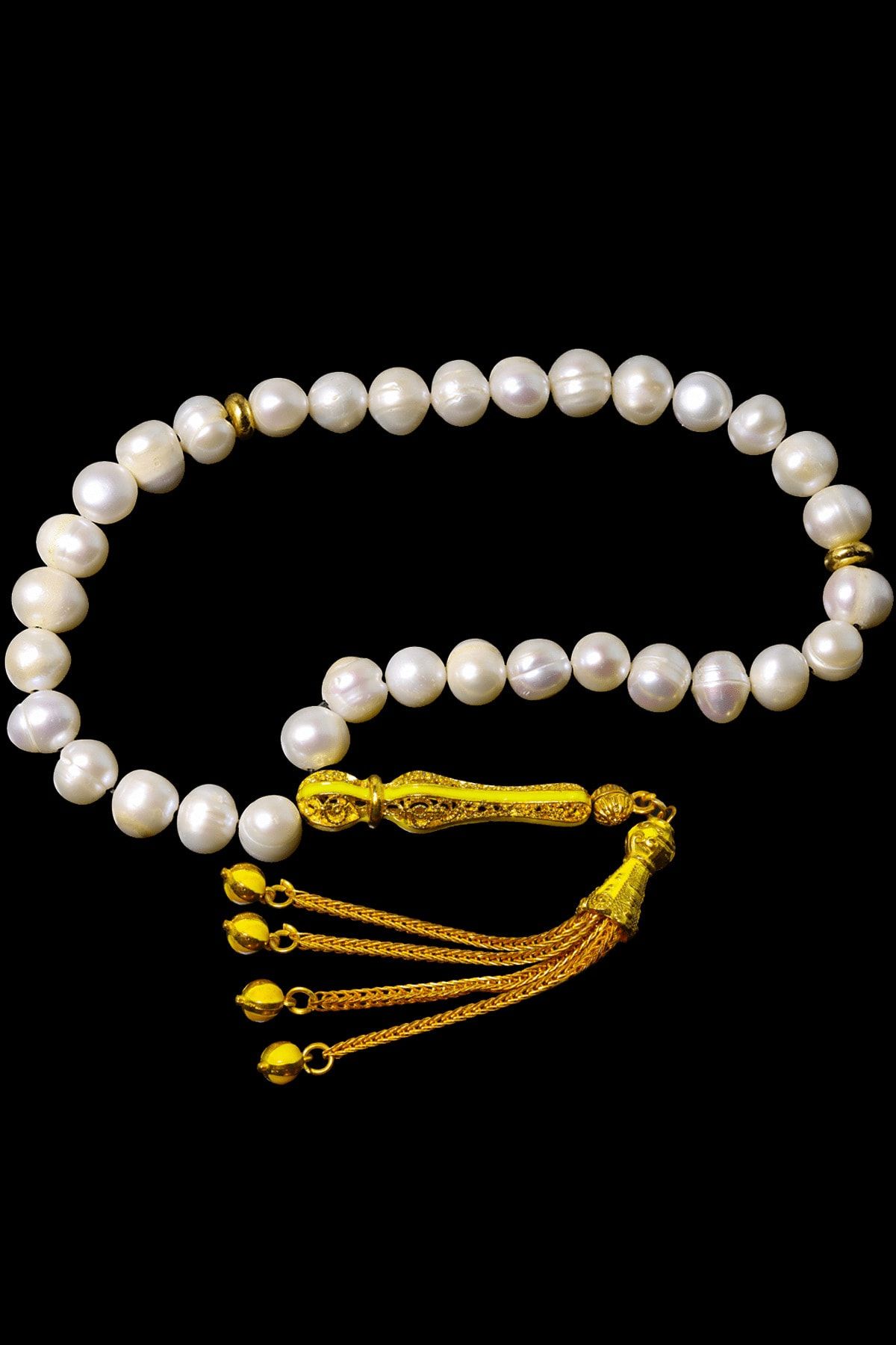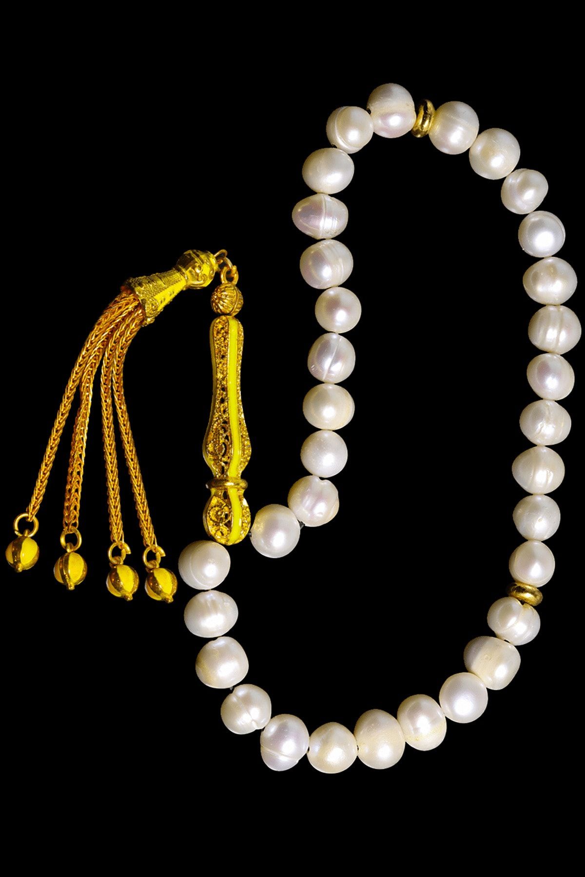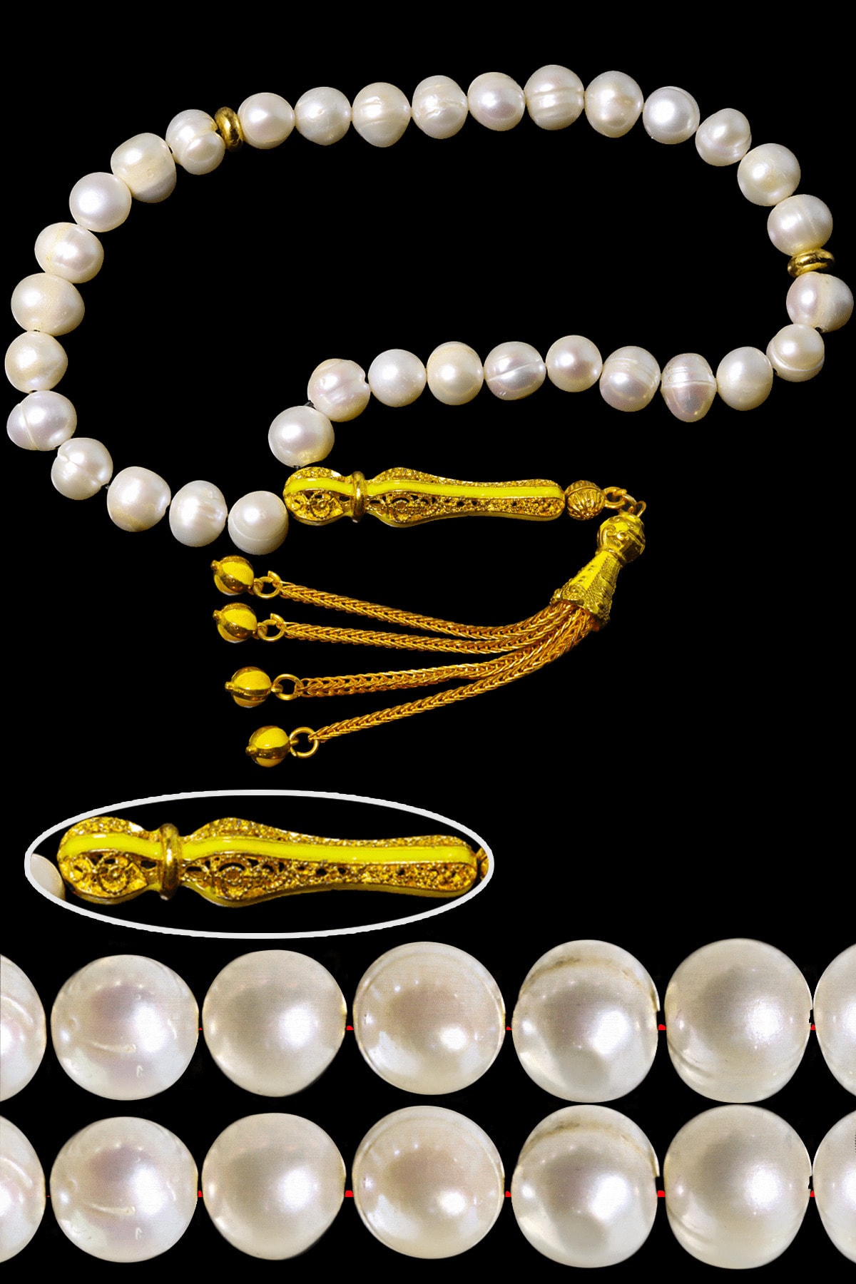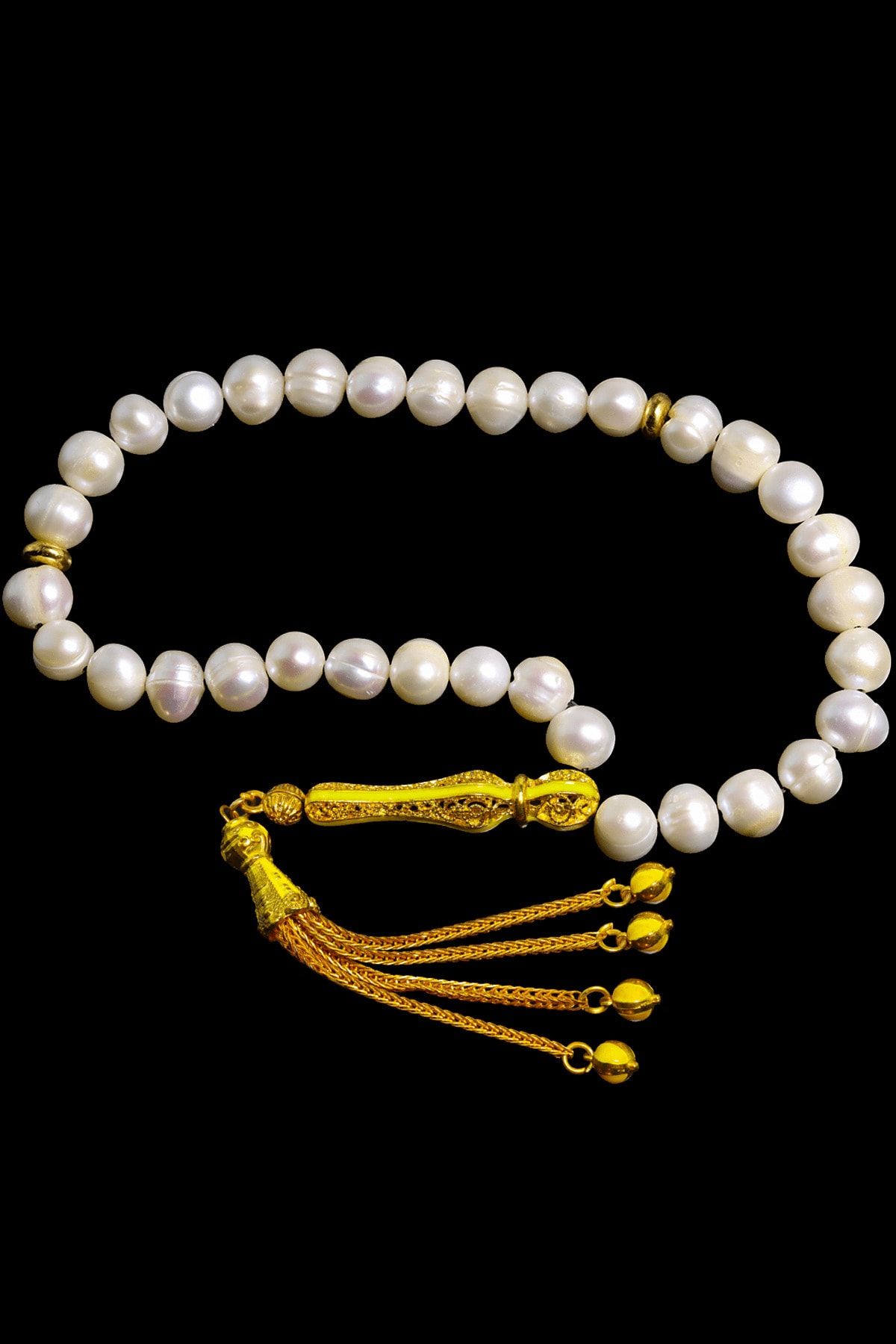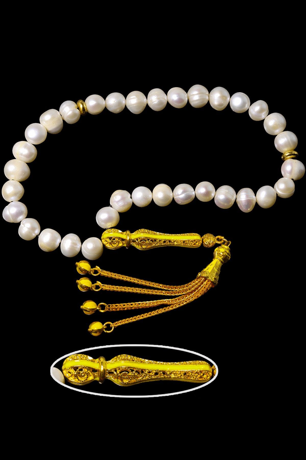 Sarı Turkuaz Mineli Telkari Püsküllü Doğal Istiridye Inci Tesbih Beyaz Mineli Siyah Telkari Püsküllü