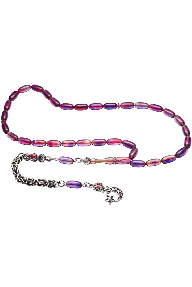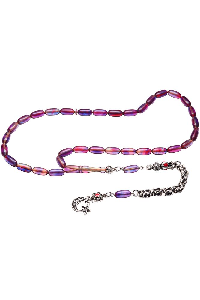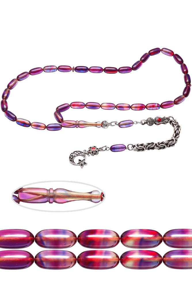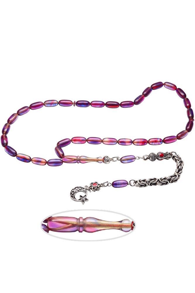 Bu tasarımda; Şeffaf kırmızı ve mor renkli özel renk alan kaliteli sıkma kehribar reçine kullanılmıştır.