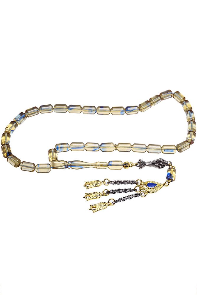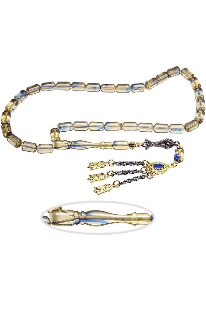 Şeffaf Mavi Hareli Altın Kaplama Püsküllü Ateş Kehribar Tesbih