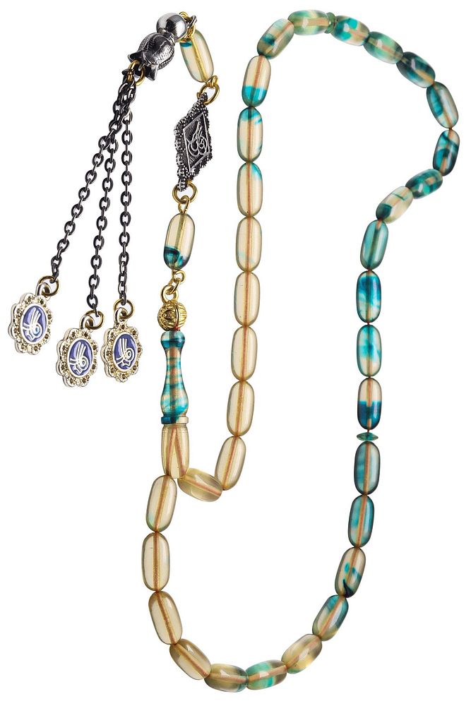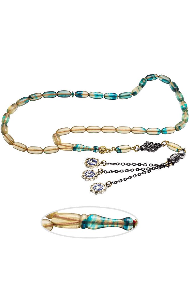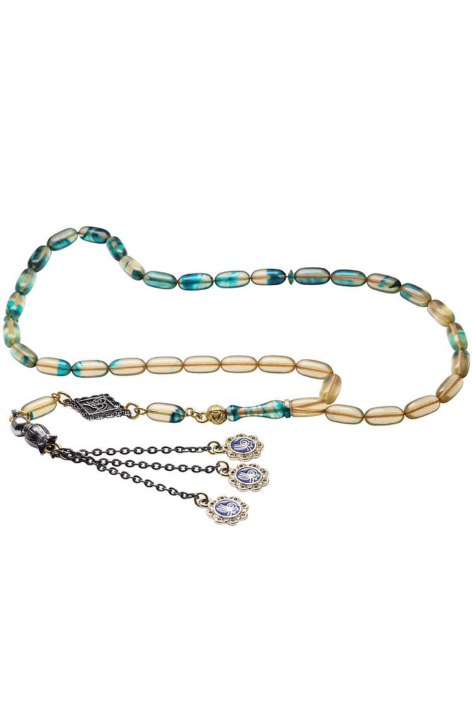 Ürün ya da Doğal Taş Açıklaması (Ağrı Kesici, Sinir Stres ve Bereket Taşı) Ateş kehribar tesbih modelleri, ''Tesbih Atölyesi'' Atölyelerinde ustalarımız tarafından kuru torna işciliği ile elde özen ile tane tane işlenmektedir. Ürünlerimiz el işciliği olduğu için sınırlı sayıda üretilmektedir. Tasarımlarımızda kullandığımız reçineler Dünya'nın en kaliteli reçineleridir. Kısa bir süre içerisinde renk alır ve koku verir. Ürünleriniz orijinallik ve garanti belgesi ile gönderilir. Tasarımlarımıza üç kat cila atılmıştır. Muhteşem bir çekime sahip koleksiyonluk ve günlük çekim için ideal ürünlerdir. Bu tasarımda; Şeffaf turkuaz renk geçişli özel 1.sınıf kalitede renk alan ve koku veren kaliteli ateş kehribar reçine kullanılmıştır. Her kehribar tanesi birbirinin aynısı olmadığı için küçükte olsa farklılıklar gösterebilir. Üretildiği Malzeme; Ateş Kehribar; Ana Renk; Şeffaf Turkuaz Renk; Ağırlık; 20-30 gr; Tane Şekli; 5.5x11 mm; Tane Ölçüsü; Beyzi Kesim; Toplam Uzunluk; 20-30 cm; İmame ve Püskül Maddesi; Düşük Ayar Gümüş;