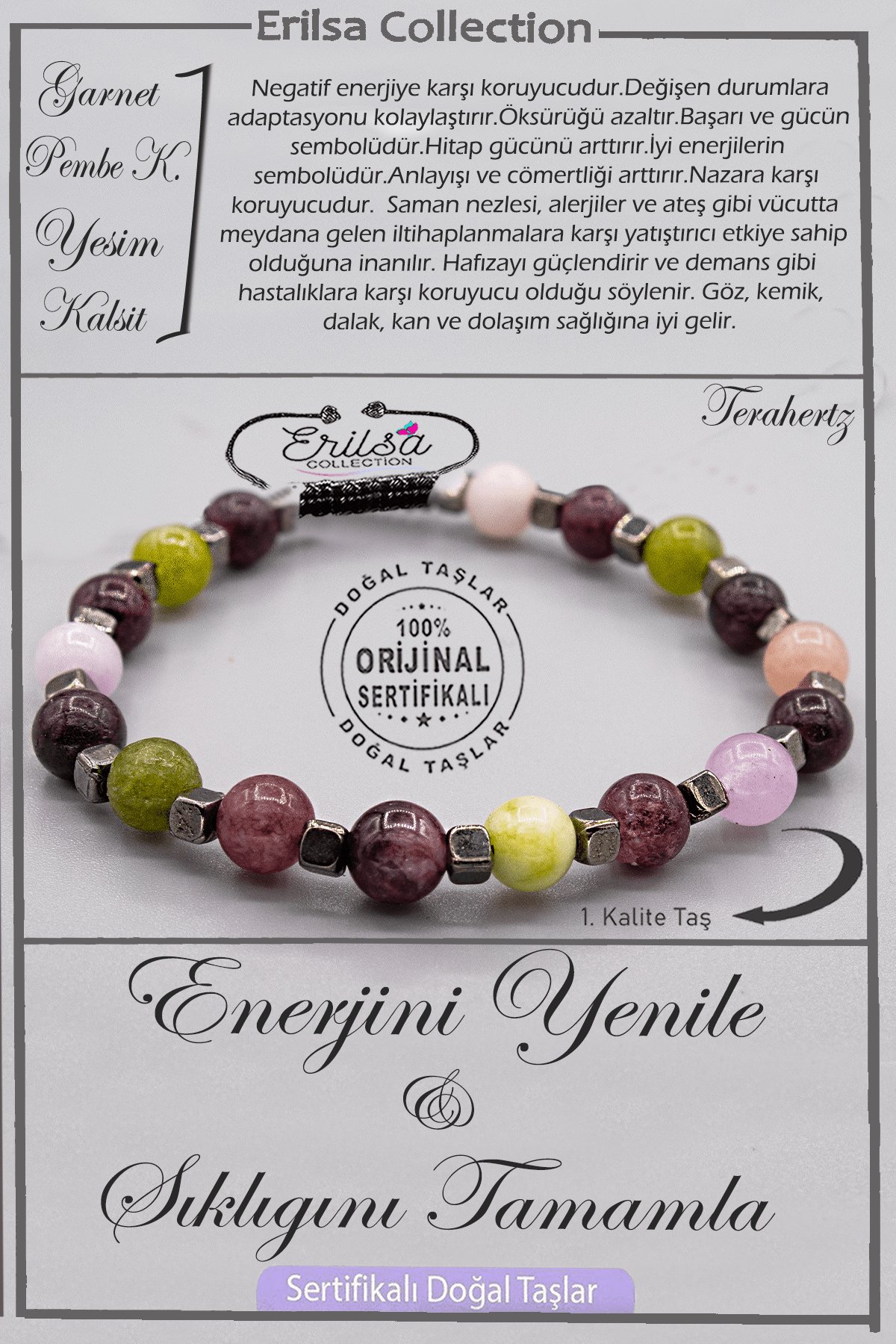 Serifikalı AAA+ Kalite Doğal Terahertz - Lal Pembe Kuvars Yeşim ve Kalsit Enerji Bilekliği