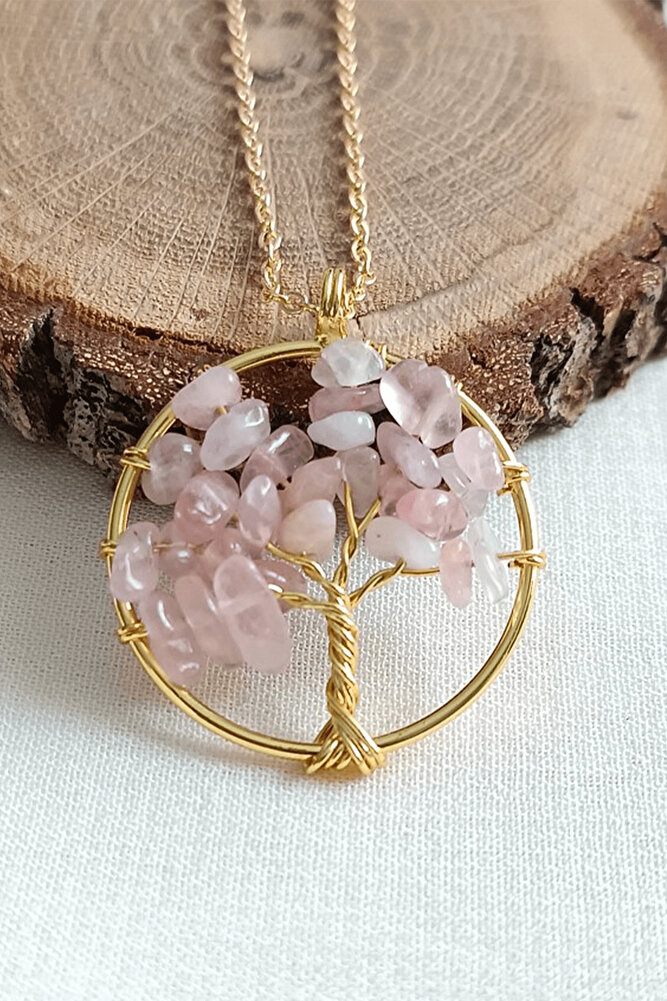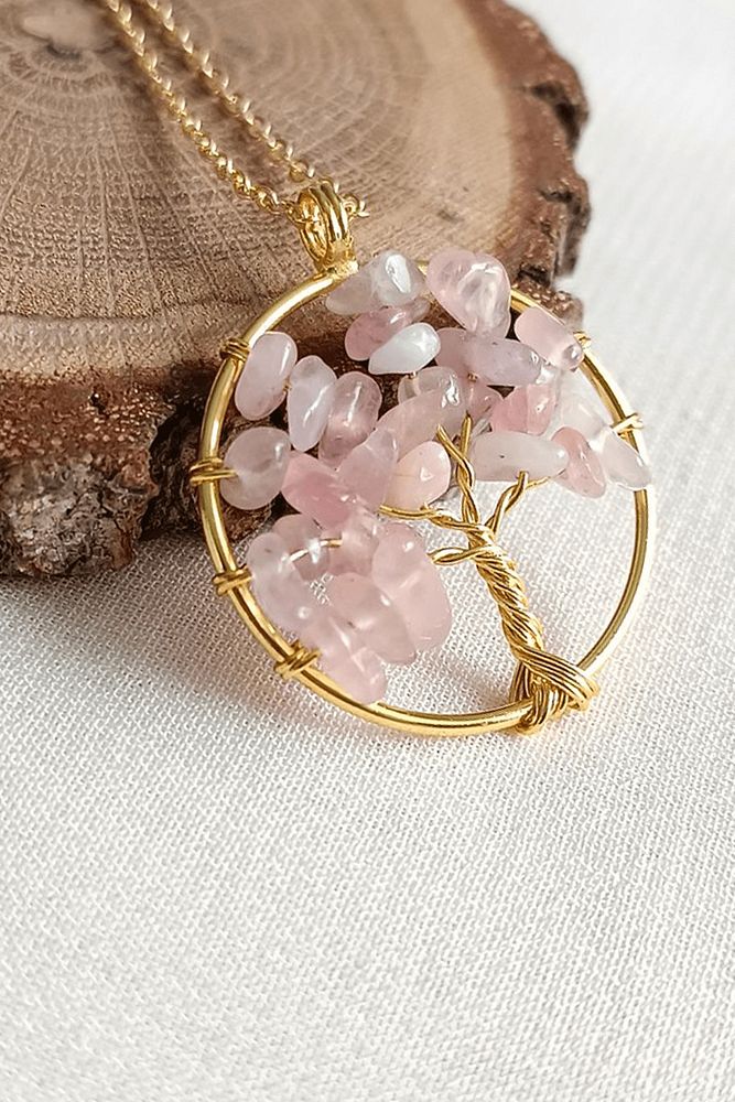 Sertifalı Gold Pembe Kuvars Taşı Hayat Ağacı Kolye