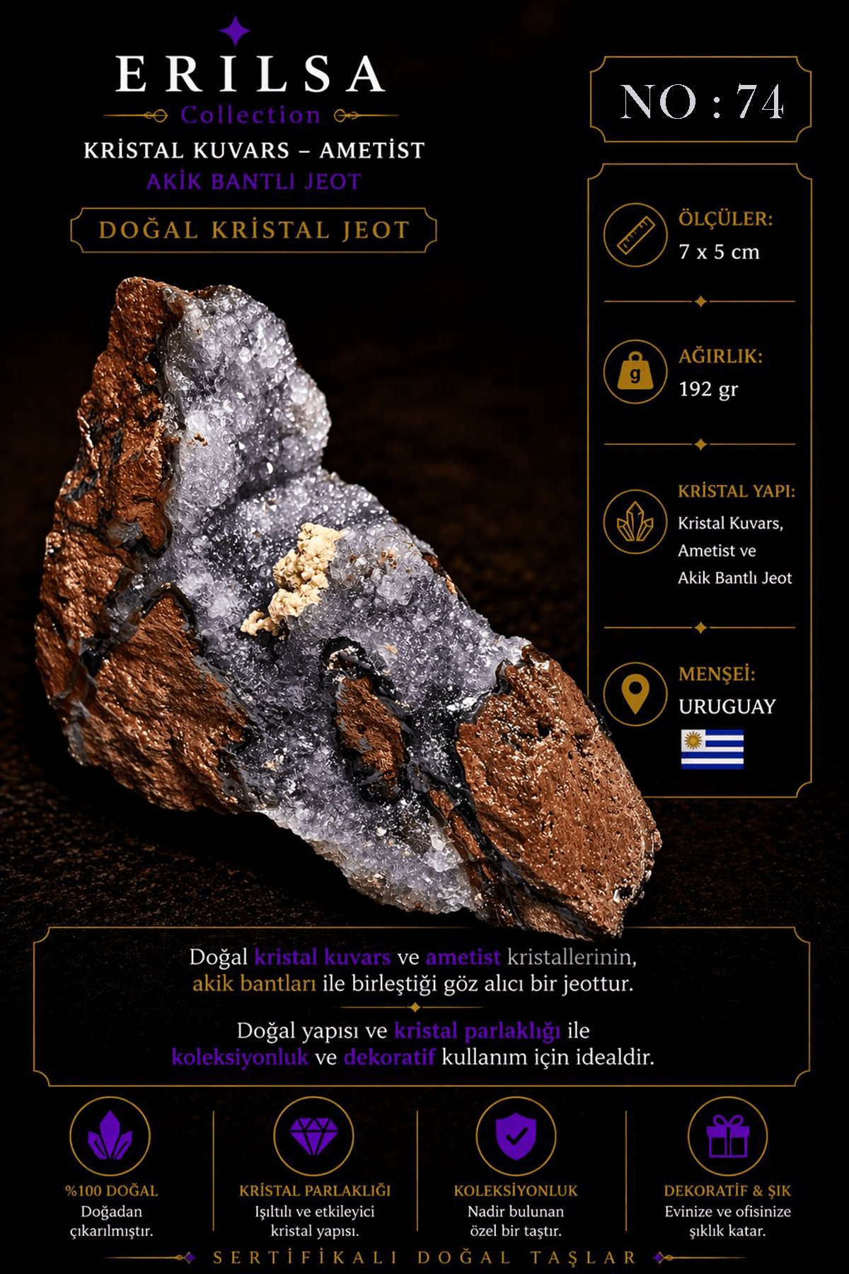 Sertifikalı Doğal Ametist Jeodu Akik Bantlı Kristal Kuvars Ham Kaya Uruguay NO74