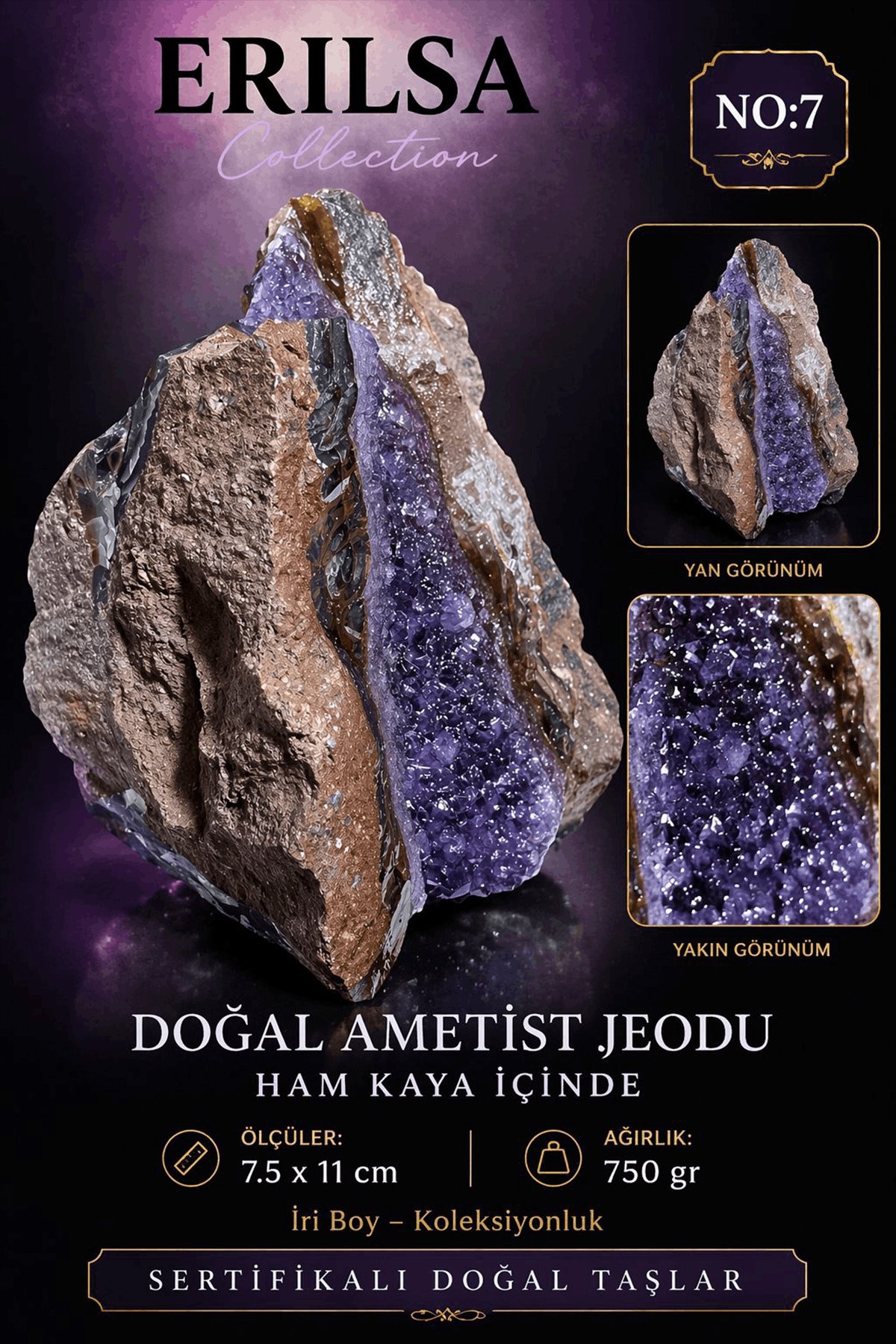 Ham kaya içerisinde gelişmiş ametist kristalleri barındıran bu doğal taş kütle, katmanlı yapısı ve mor ton geçişleri ile dikkat çeker
