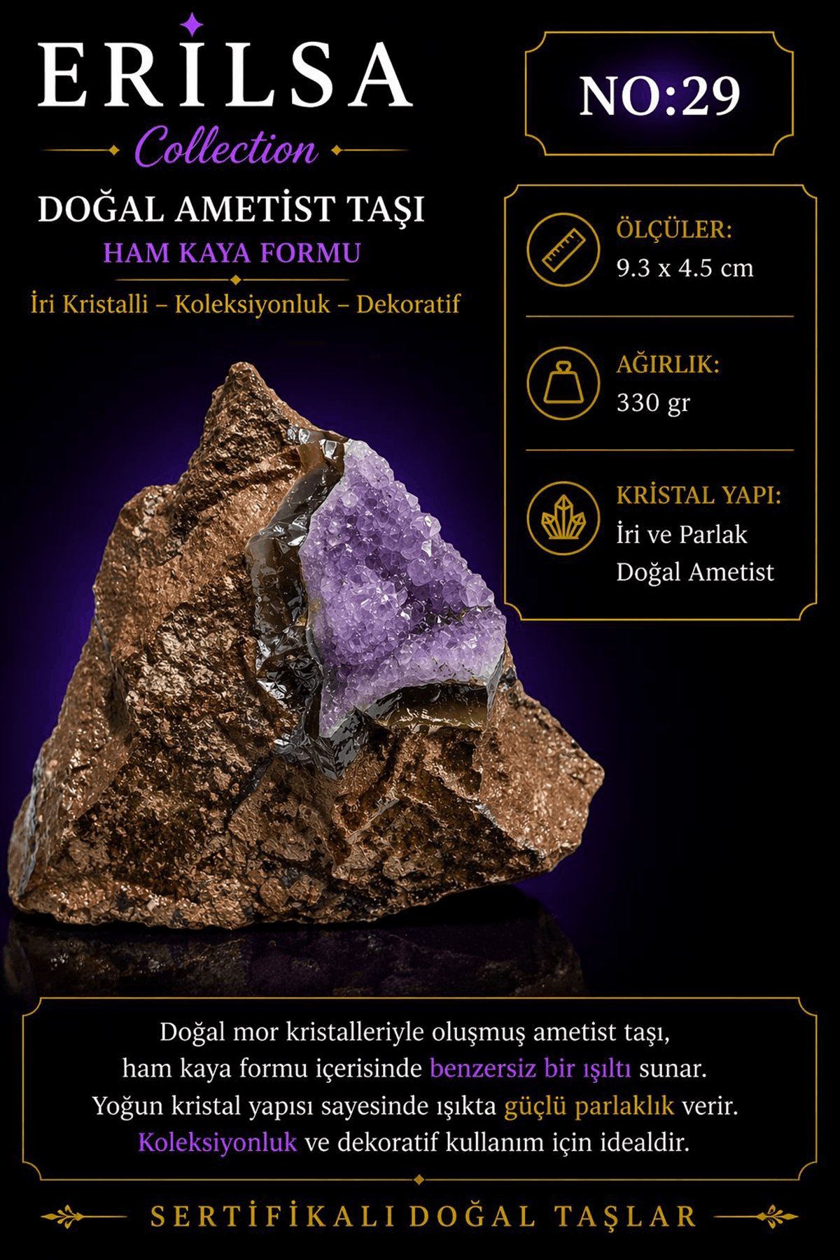 9.3 x 4.5 cm ölçülerinde ve 330 gram ağırlığında olan bu doğal ametist taşı, küçük boyutuna rağmen yoğun kristal yapısıyla dikkat çeker
