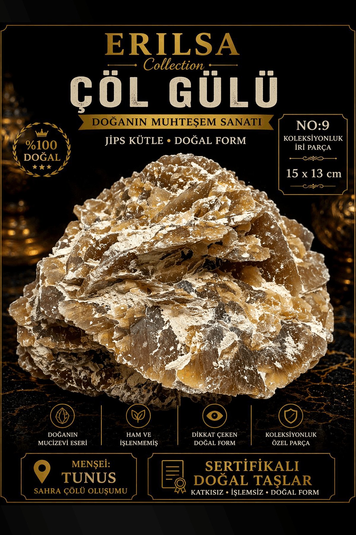 Sertifikalı Çöl Gülü Taşı Kütle - 15x13 cm Koleksiyonluk İri Doğal Jips Kütle