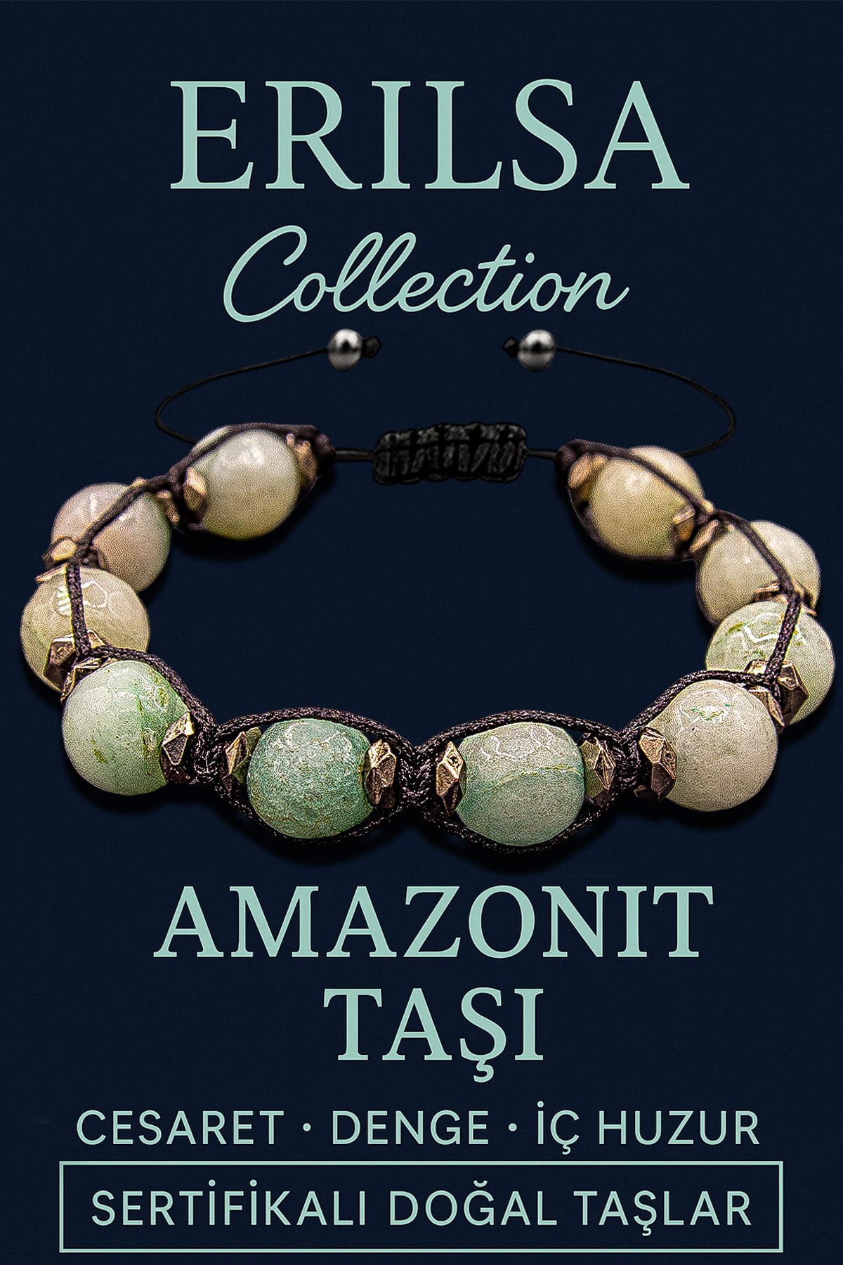 Amazonit’in yumuşak mavi-yeşil tonları, Terahertz’in parlak gri fasetli dokusuyla birleşerek hem ferah hem güçlü bir görsel sunar. İri boy taşlar bilekte gösterişli ve kararlı bir enerji alanı oluşturur.