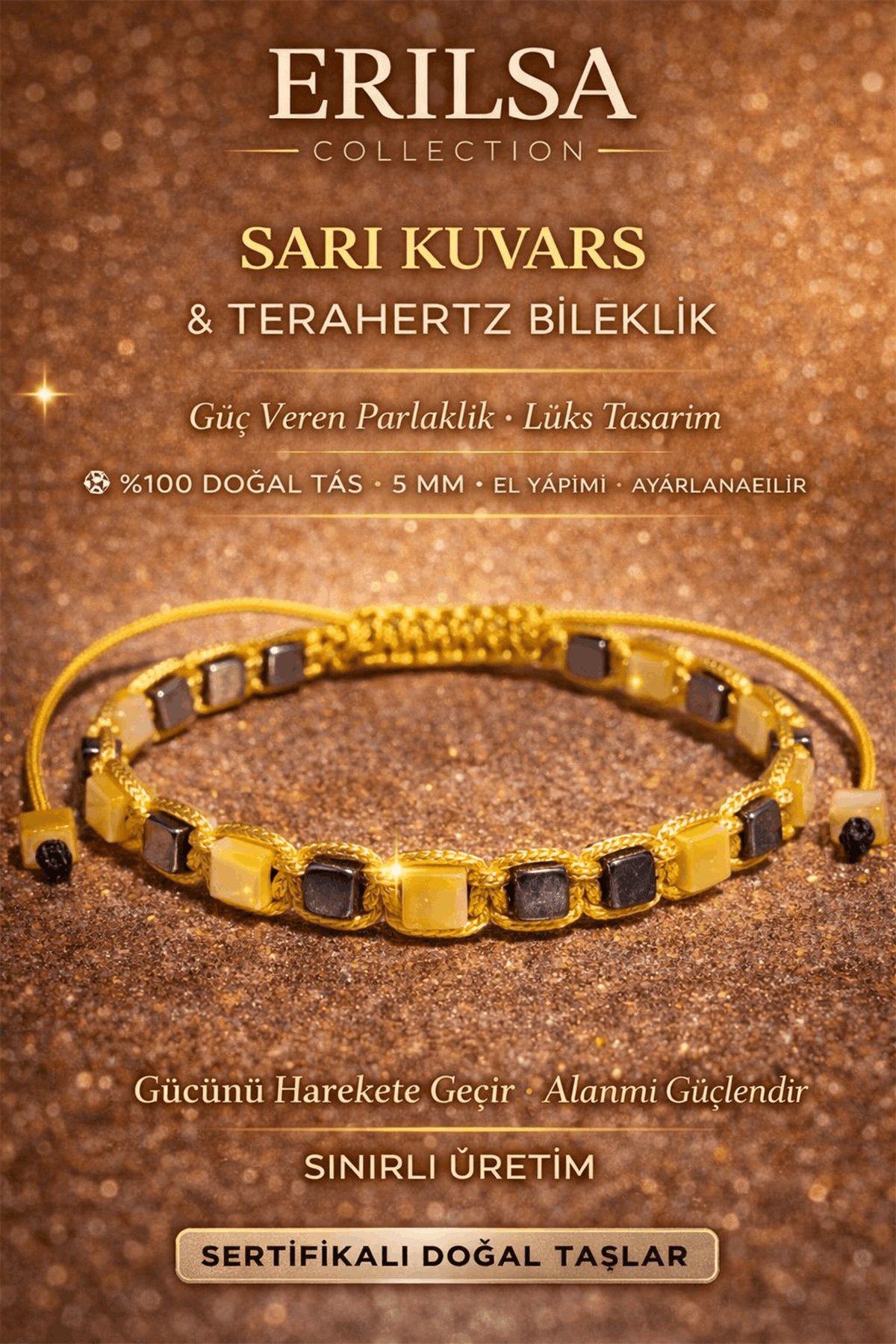 Sertifikalı Sarı Kuvars Taşı Bileklik - 5 mm Küp Kesim Terahertz Doğal Taş Ayarlanabilir