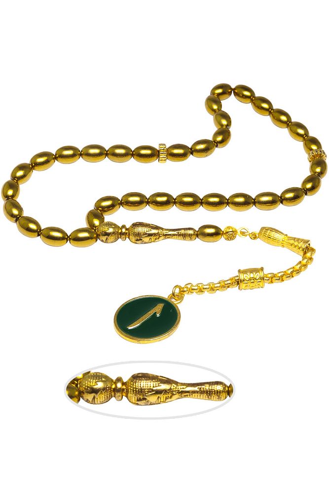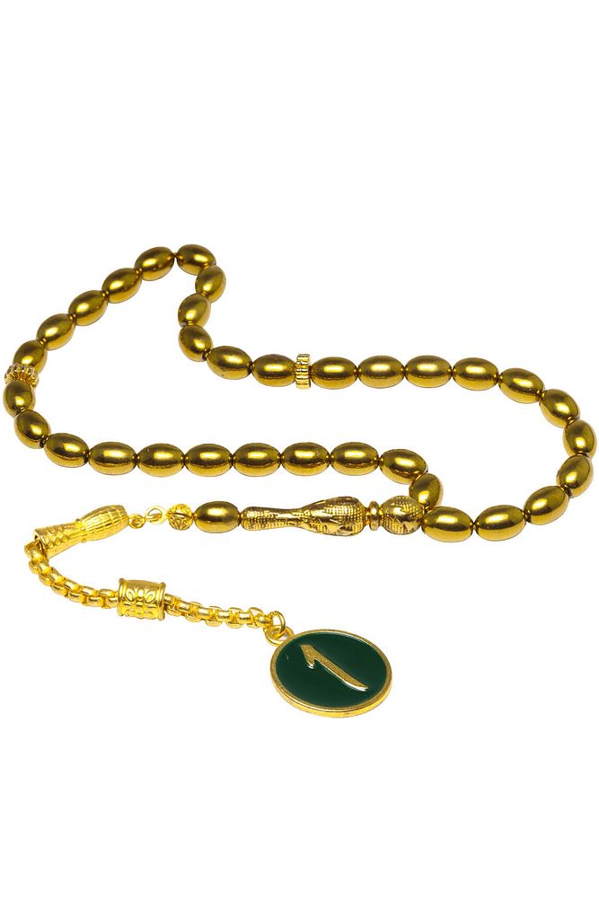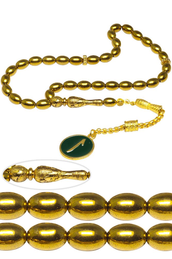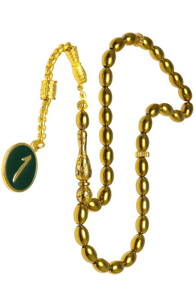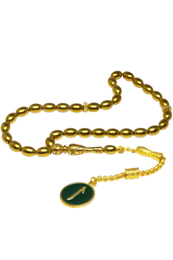 Ürün ya da Doğal Taş Açıklaması; ; (Kan, Cesaret ve Bereket, Nazar Taşı); ; Hematit tesbih modelleri, \'\'Tesbih Atölyesi\'\' Atölyelerinde ustalarımız tarafından kuru torna işciliği ile elde özen ile tane tane işlenmektedir. Ürünlerimiz el işciliği olduğu için sınırlı sayıda üretilmektedir. Tasarımlarımızda kullandığımız taşlar Dünya\'nın en kaliteli hematit taşlarını kullanmaktayız. Kan ile ilgili rahatsızları ortadan kaldırır. Nazardan, beladan korur. Yedek ipi gönderilir ve ürünlerimiz \'\'Tesbih Atölyesi\'\' koruyucu ağaç kutusu ile gönderilmektedir. ; ; Bu tasarımın yapımında; Altın kaplama hematit taşı kullanılmıştır. İmame ve püskül tasarımında; Altın kaplama imame ve püskül seti kullanılmıştır. Çift kaplama atıldığı için renk atmaz ve kararmaz bir yapıya sahiptir. ; ; Üretildiği Taş; Hematit Taşı; Ana Renk; Altın Kaplama Renk; Ağırlık; 20-30 gr; Tane Şekli; 7x11 mm; Tane Ölçüsü; Beyzi Kesim; Toplam Uzunluk; 20-30 cm; İmame ve Püskül Maddesi; Düşük Ayar Gümüş;