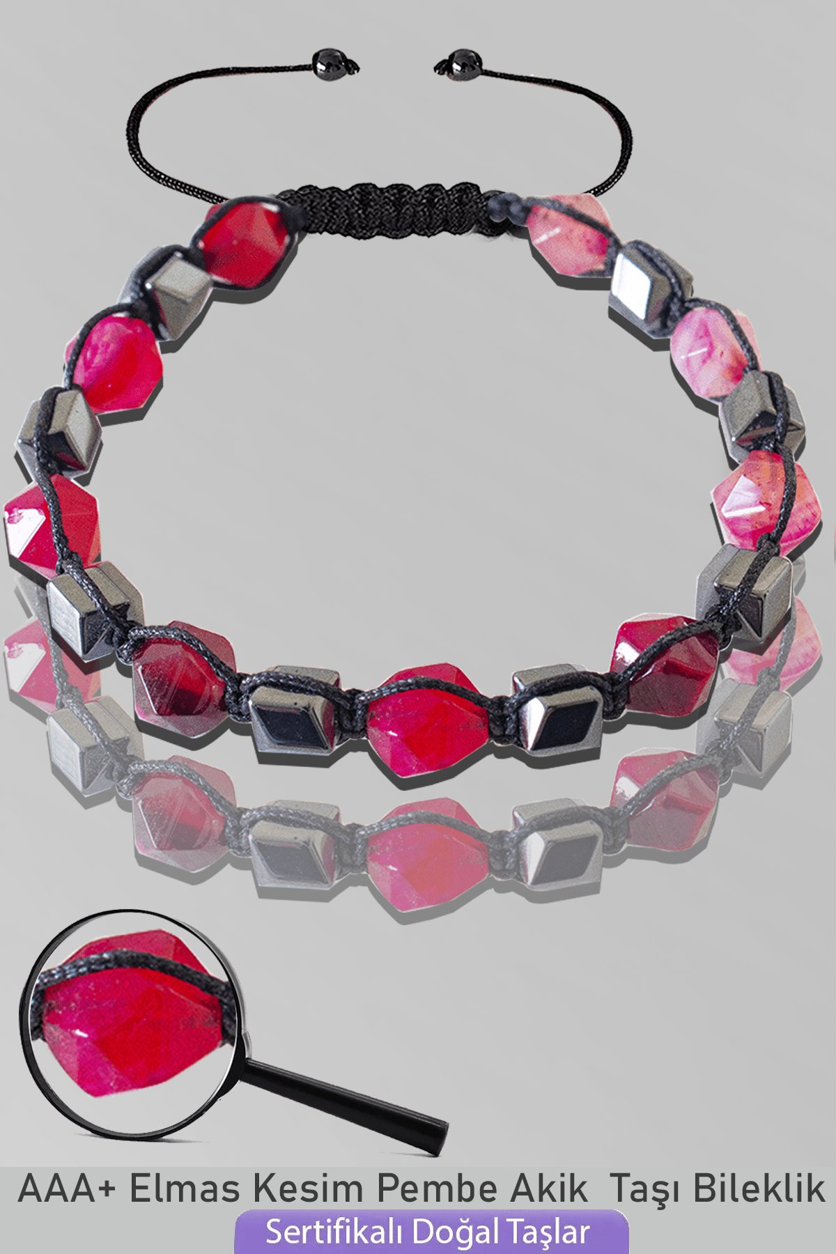 Sertifikalı AAA+ Elmas Kesim Terahertz - Pembe Akik Taşı Bileklik - Ayarlamalı