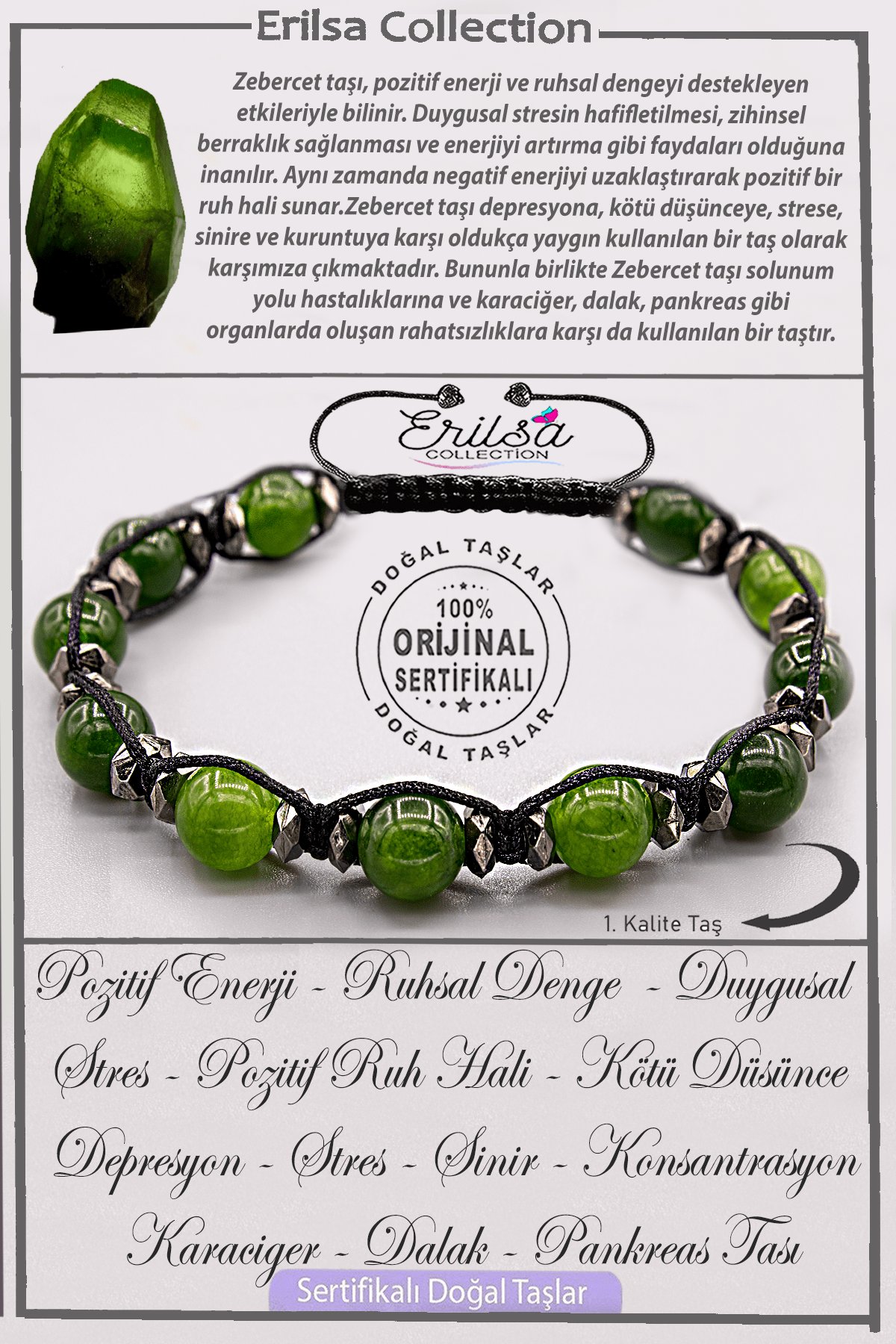 Sertifikalı AAA+ Kalite Gerçek Terahertz - Zebercet Taşı Bileklik - Peridot