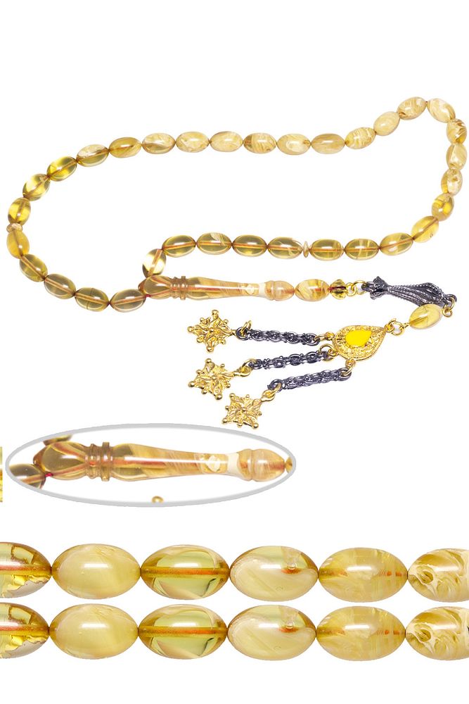 Sertifikalı Açık Sarı Renkli Hareli Sıkma Kehribar Tesbih