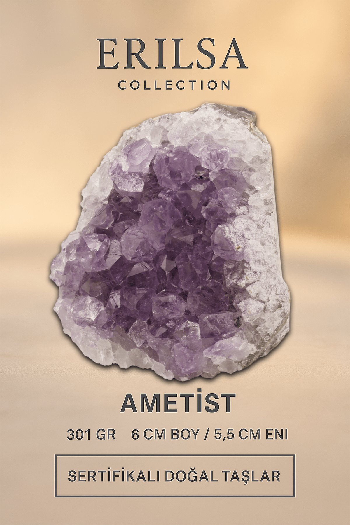 Doğanın içinden gelen yüksek enerjili bu 301 gramlık sertifikalı ametist taşı, kristal yapısı ve iri boyutuyla hem şifasal hem de estetik olarak güçlü bir etki sunar. Yaklaşık 8-10 cm boyutlarında olan bu ham kristal kütle, morun en derin tonlarını barındırarak bulunduğu ortama dinginlik ve zarafet katmaktadır.