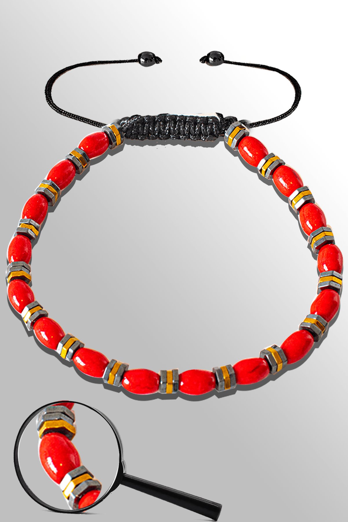 Sertifikalı Arpa Model Hematitli Kırmızı Mercan Taşı Bileklik - Ayarlamalı