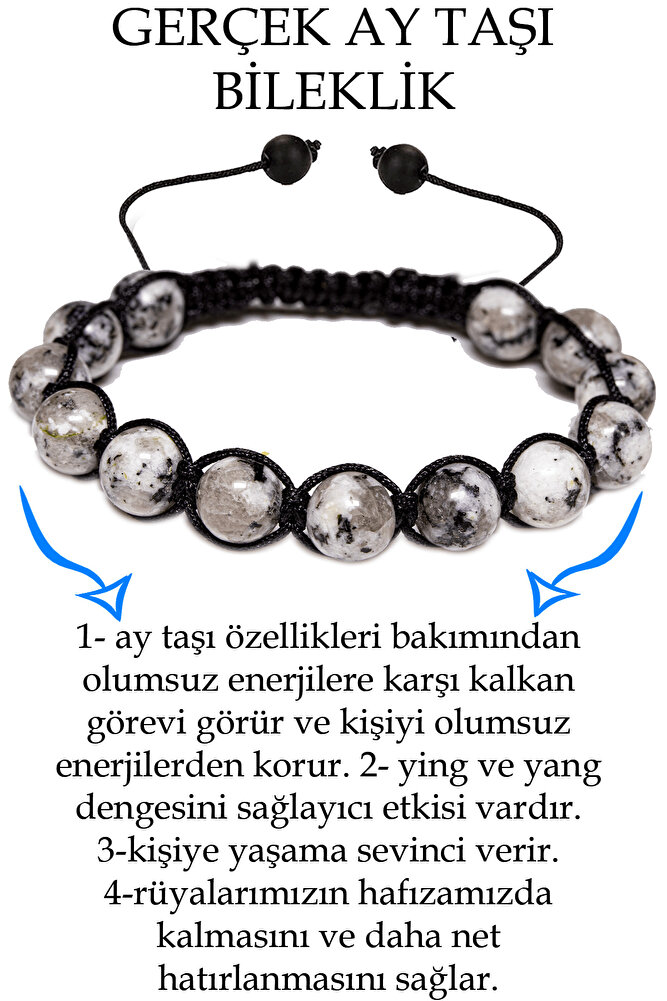 Doğal ay taşı bileklik el işciliği sanatı olarak sizlere özel olarak hazırlanmıştır. Ücretsiz Kargo ve Taksit İmkanlarını sakın kaçırmayın. Sinir ve stresi alacak negatif enerjilerinizi ortadan kaldırır. Sizleri gevşetir. Ürünümüz her bileğe uygun olarak tasarlanmıştır.