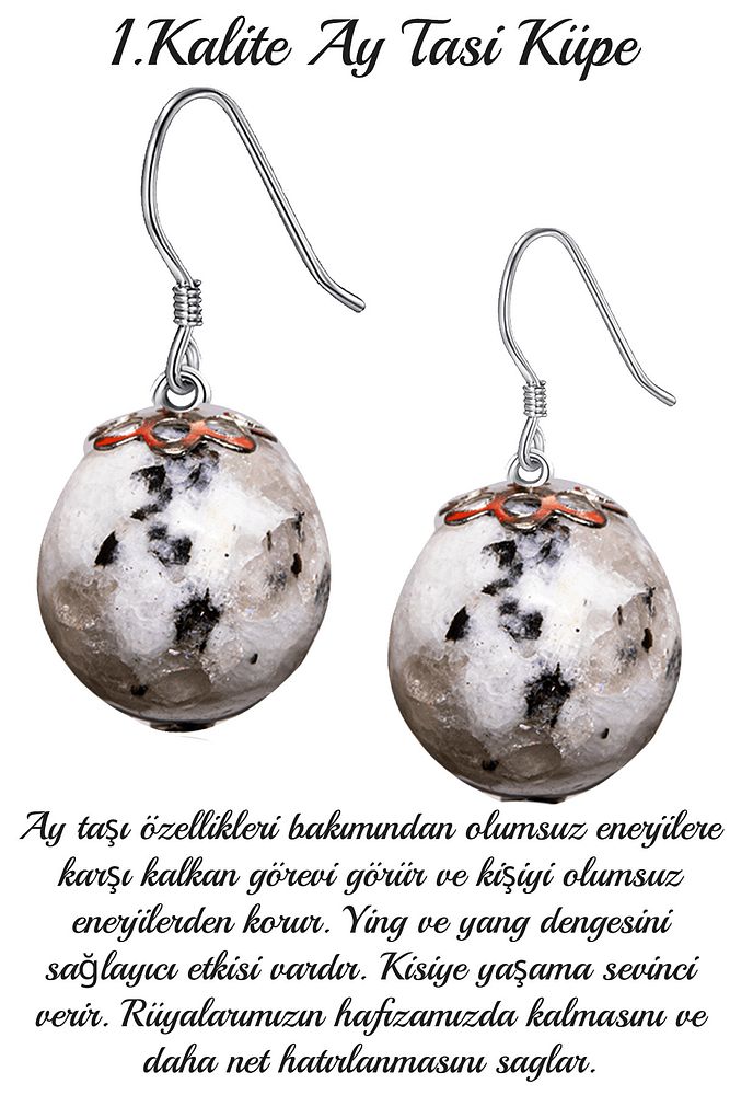 Ay taşı doğal taş küpe, modellerimizin taşlarının kalitelisi inanılmazdır. Pozitif enerjiler verir ve negatif enerjilerinizi yok edecektir. Doğal taşların hiç biri birbirinin aynısı olmadığı için küçükte olsa farklılıklar gösterebilir. Ürünlerimiz sizlere orijinallik sertifikası ve garanti belgesi ile gönderilmektedir. \'\'Tesbih Atölyesi\'\' koruyucu kadife kesesinde gönderilecektir.