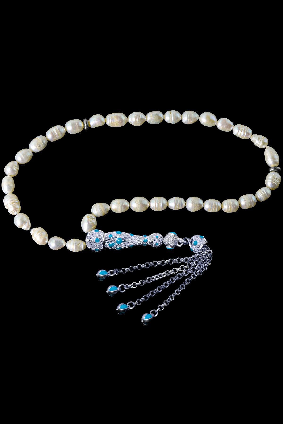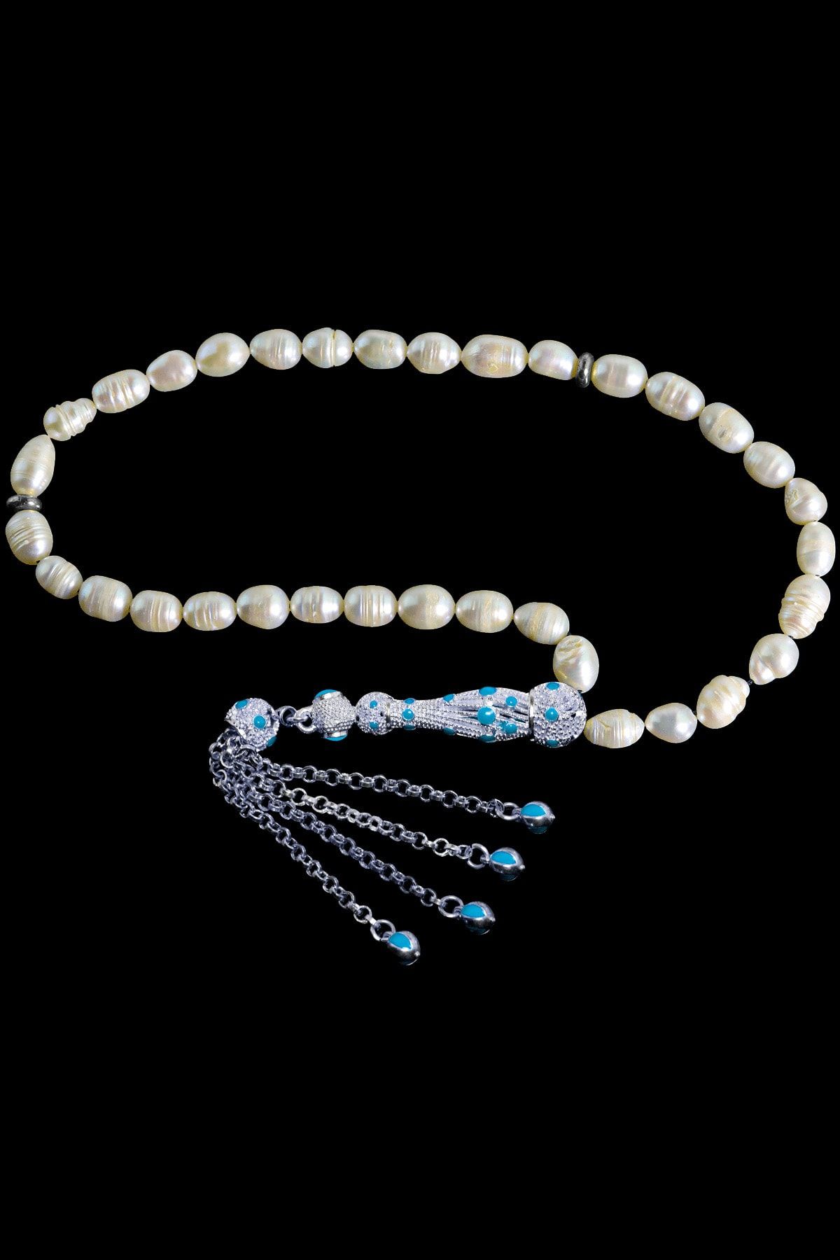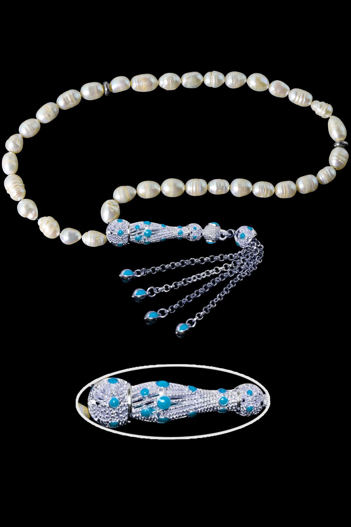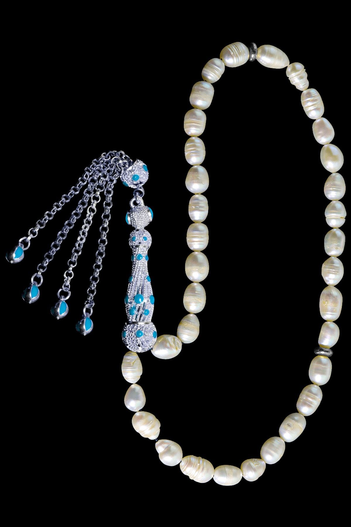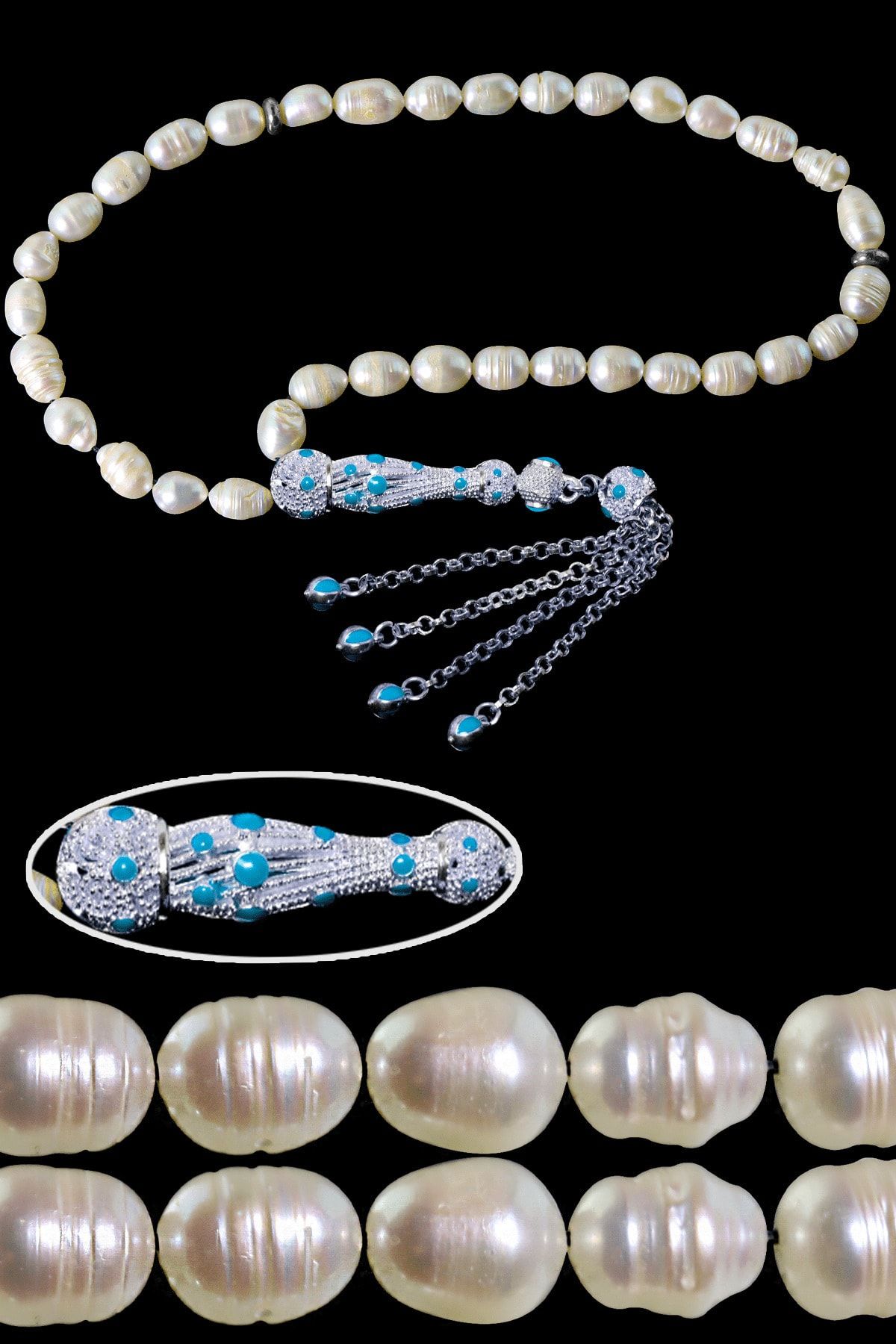 Sertifikalı Beyaz Mavi Mineli Telkari Püskül Doğal Istiridye Inci Tesbih Beyaz Siyah Mineli Telkari Püsküllü