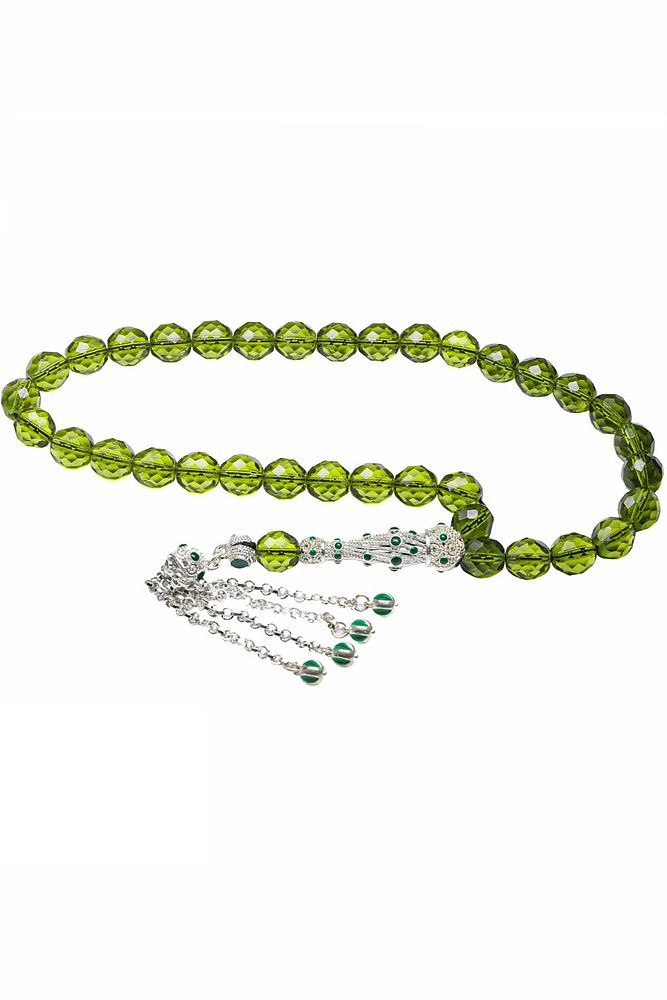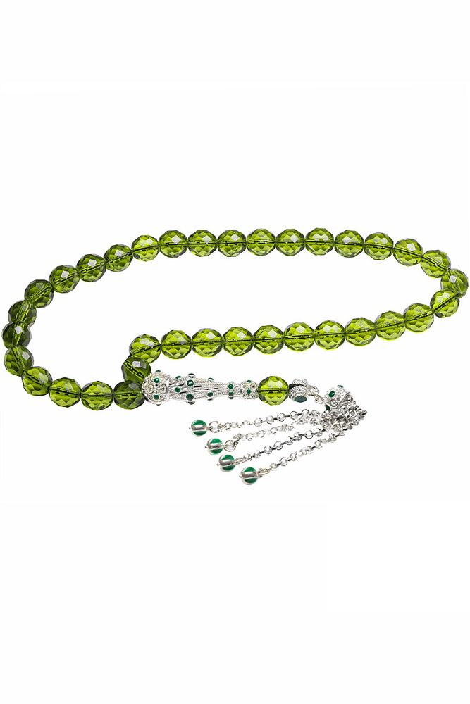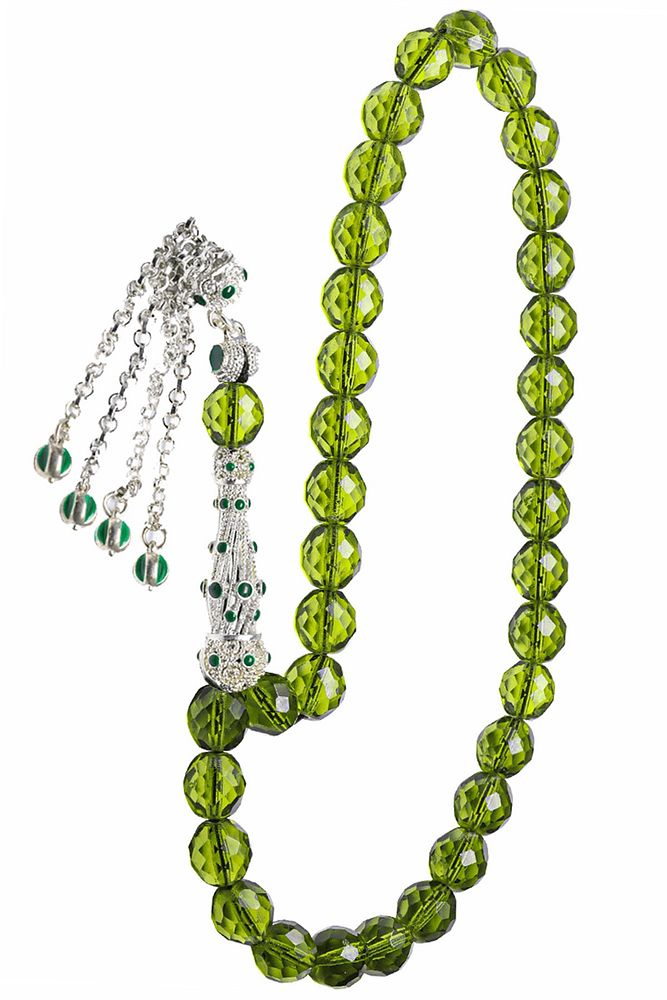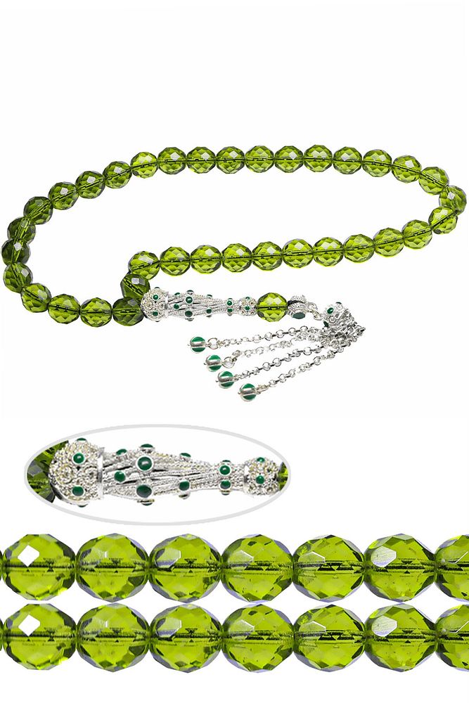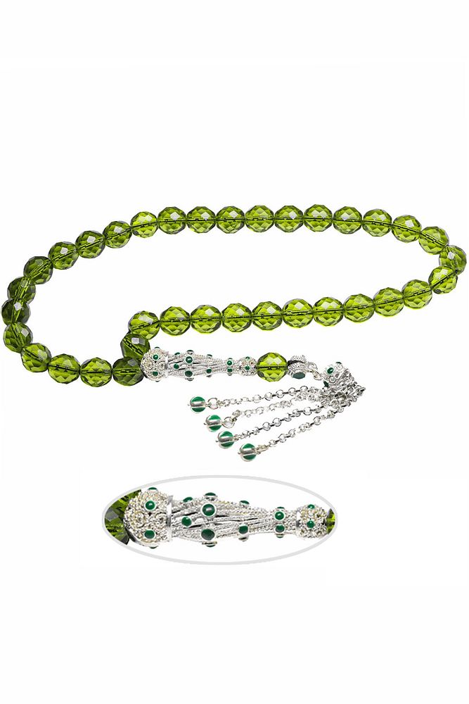 ; Ürün ya da Doğal Taş Açıklaması; ; (Para - Sağlık - Pozitif Enerji Taşı); ; Kuvars tesbih modelleri, ''Tesbih Atölyesi'' Atölyelerinde ustalarımız tarafından kuru torna işciliği ile elde özen ile tane tane işlenmektedir. Ürünlerimiz el işciliği olduğu için sınırlı sayıda üretilmektedir. Tasarımlarımızda kullandığımız taşlar Dünya'nın en kaliteli doğal taşlarını kullanmaktayız. Tasarımlarımızda kullandığımız doğal taşların hiç biri birbirinin aynısı olmadığı için küçükte olsa farklılık gösterebilir. Doğal taşlar vücudunuza temas ettiği anda negatif enerjilerinizi alır ve pozitif enerjiler verir.; ; Bu tasarımda; Yeşil renkli iri boy fasetli kuvars taşı ve Beyaz altın kaplama yeşil mineli telkari imame ve püskül seti kullanılmıştır. Çift kaplama atıldığı için renk atmaz ve kararmaz bir yapıya sahiptir. Yedek ip ile gönderim sağlanır. ; ; Üretildiği Taş; Kuvars; Ana Renk; Doğal Renk; Ağırlık; 40-50 gr; Tane Şekli; 10x10 mm; Tane Ölçüsü; Küre Kesim; Toplam Uzunluk; 20-30 cm; İmame ve Püskül Maddesi; Düşük Ayar Gümüş;