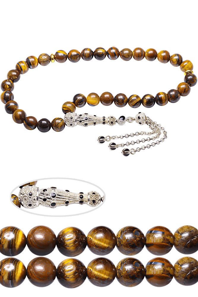 Ürün ya da Doğal Taş Açıklaması (Cesaret, Astım, Dalak, Pankreas, Mide ve Kalp Rahatsızlıkları Taşı) Kaplan gözü tesbih modelleri, \'\'Tesbih Atölyesi\'\' Atölyelerinde Dünya\'nın en kaliteli doğal taşlarını ithal etmekte ve işlemekteyiz. Ürünlerimiz el işciliği olduğu için sınırlı sayıda üretilmektedir. Tasarımlarımızda kullandığımız doğal kaplangözü taşıdır. Ruh beden arasındaki dengeyi sağlar. Pozitif enerjiler verecek negatif enerjilerinizi alacaktır. Sinir ve stres taşı olarak bilinir. \'\'Bu tasarımda; Kahverengi kaplan gözü taşı kullanılmıştır. İmame ve püskül yapımında; Beyaz renkli siyah mineli telkari imame ve püskül seti kullanılmıştır. Zaman içerisinde kullanımda renk alır ve çektikçe kararır. Enerjisinin temizlenmesini 2 günde bir toprağa 10 dakika bırakarak üzerindeki negatif enerjileri atabilirsiniz.\'\' Üretildiği Taş; Kaplan Gözü Taşı; Renk; Doğal Renk; Ağırlık; 20-30 gr; Tane Şekli; 8x8 mm; Tane Ölçüsü; Küre Kesim; Toplam Uzunluk; 20-25 cm; İmame ve Püskül Maddesi; Düşük Ayar Gümüş;