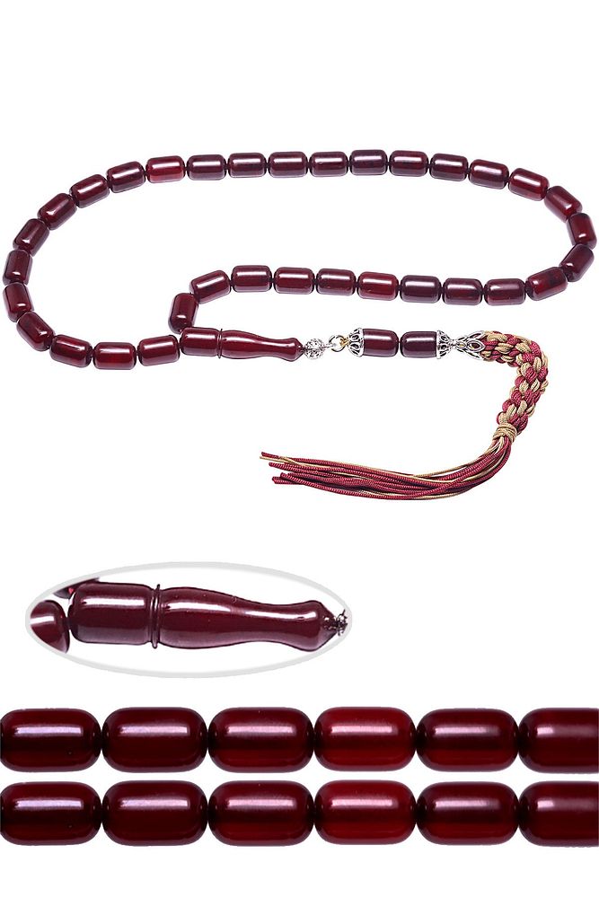 (Baş Ağrısı Sinir ve Stres) Tesbih Atölyesi, Sıkma kehribar tesbih, tasarımları özel olarak usta ellerde tasarlanır. Tasarımlarımız el yapımı olup sınırlı adette üretilmektedir. Tasarımlarda kullanılan püsküller düşük ayar gümüşten imal edilir. Tasarımlarda kullanılan kehribar taneleri hareli özel kalıplardan yapılır. Yapay reçine ile üretilmektedir. Ürünlerimiz renk almakta ve koku vermektedirler. Bu tasarımda; Kırmızı renkli osmanlı benzetmesi renk alan kaliteli çubuk sıkma kehribar reçine kullanılmıştır. Her kehribar tanesi birbirinin aynısı olmadığı için küçükte olsa farklılıklar gösterebilir. Üretildiği Malzeme; Sıkma Kehribar; Ana Renk; Bordo Renk; Ağırlık; 20-30 gr; Tane Şekli; 7.5x12 mm; Tane Ölçüsü; Kapsül Kesim; Toplam Uzunluk; 20-30 cm; İmame ve Püskül Maddesi; Makrome;