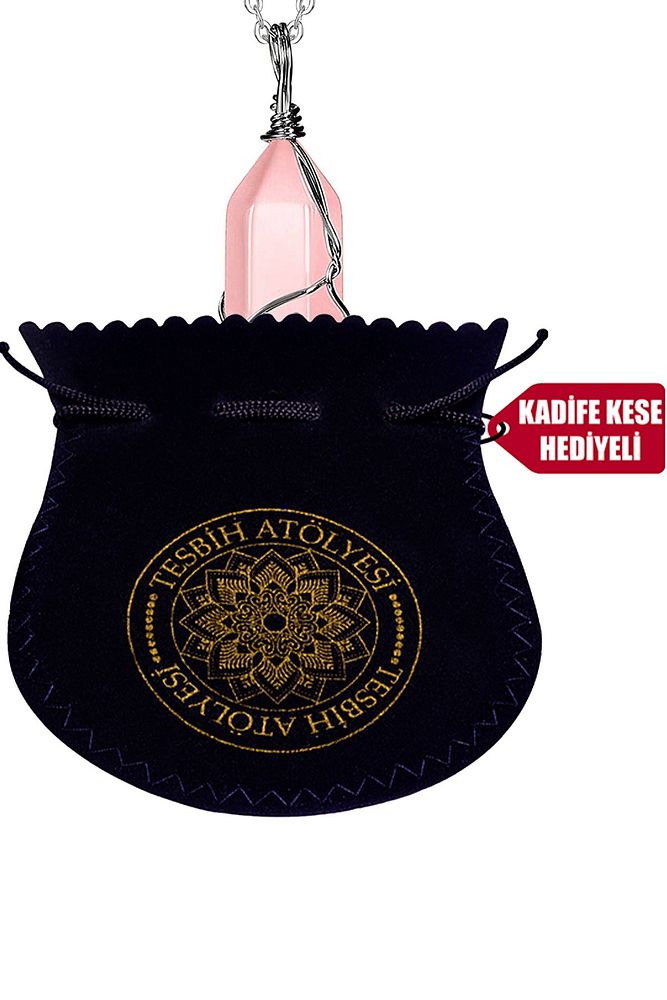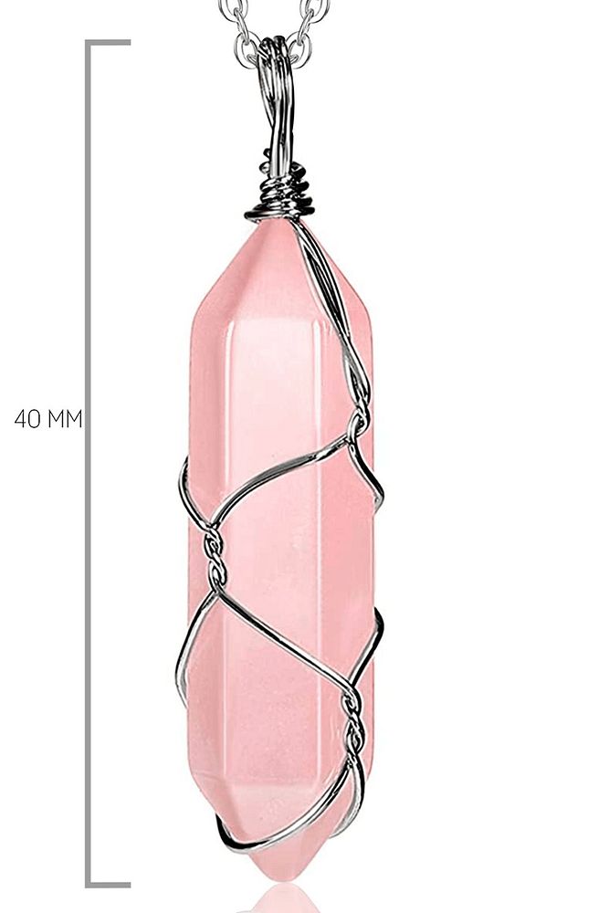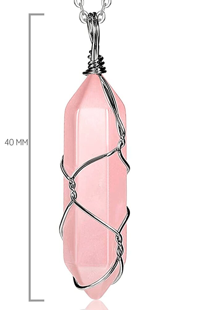 Sertifikalı Çivi Model Doğal Pembe Gül Kuvars Taşı Kolye - Tel Sargılı